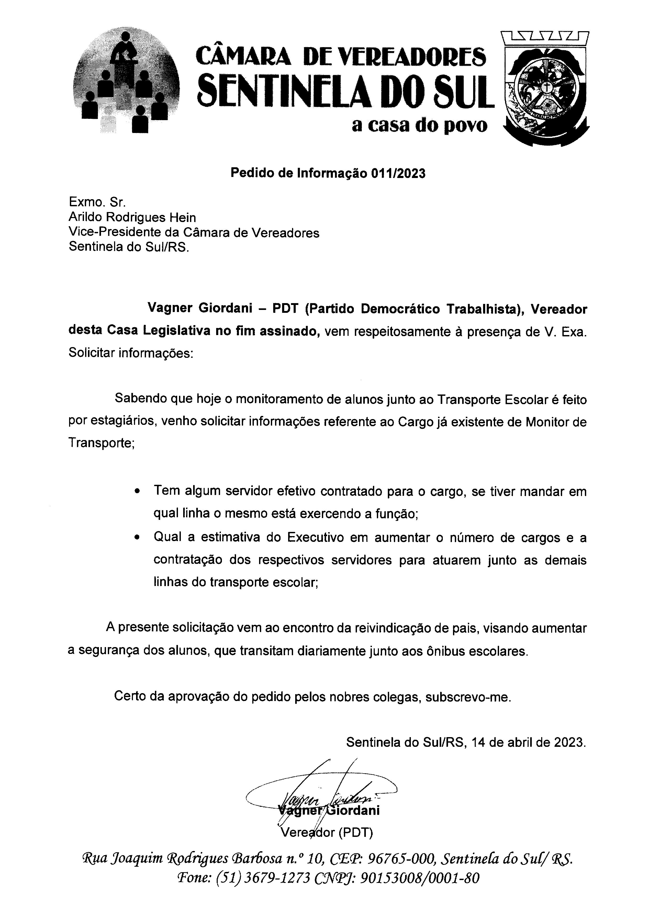 Pedido de Informação de autoria do Vereador Vagner Giordani