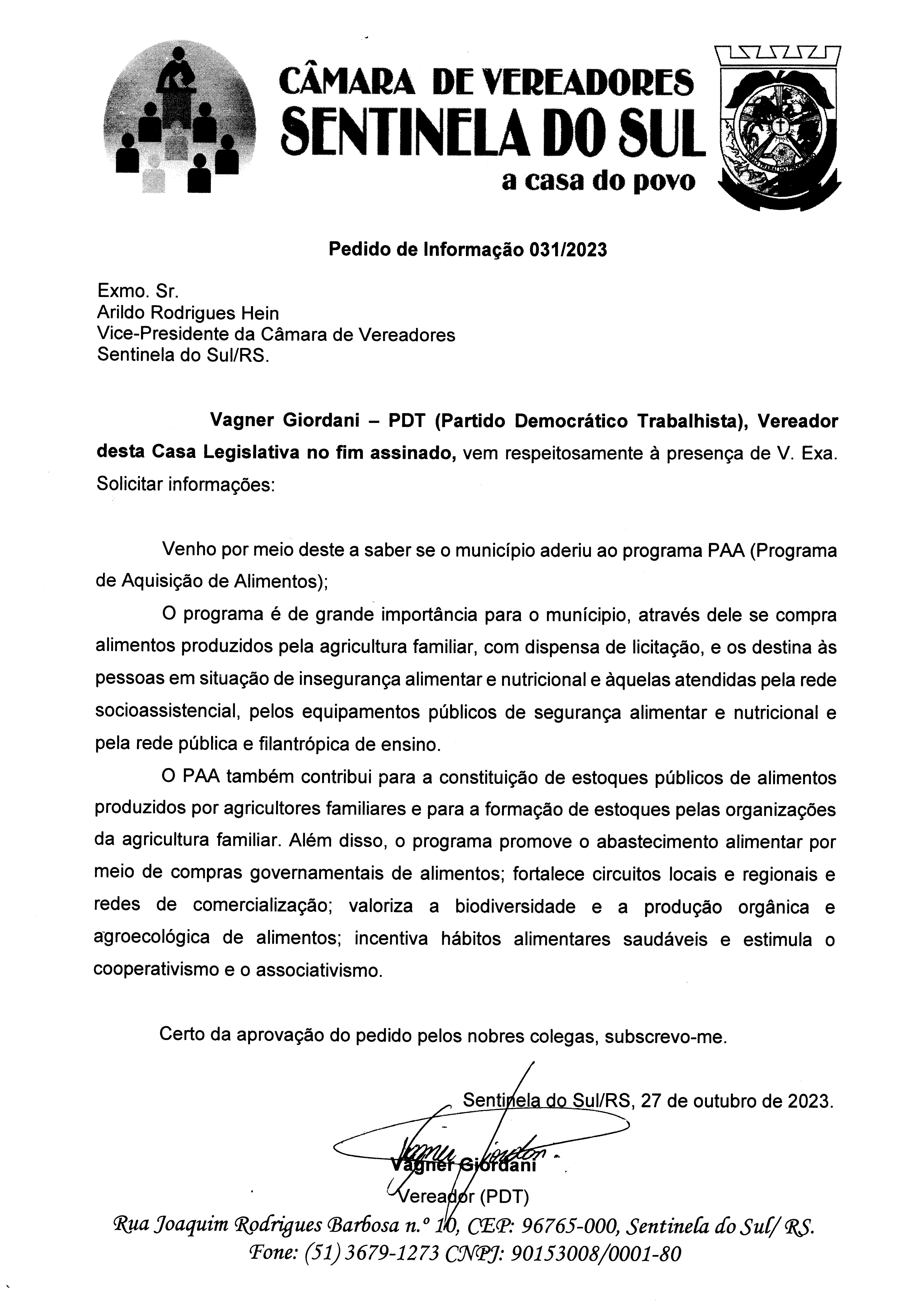 PEDIDO DE INFORMAÇÃO Nº 031/2023