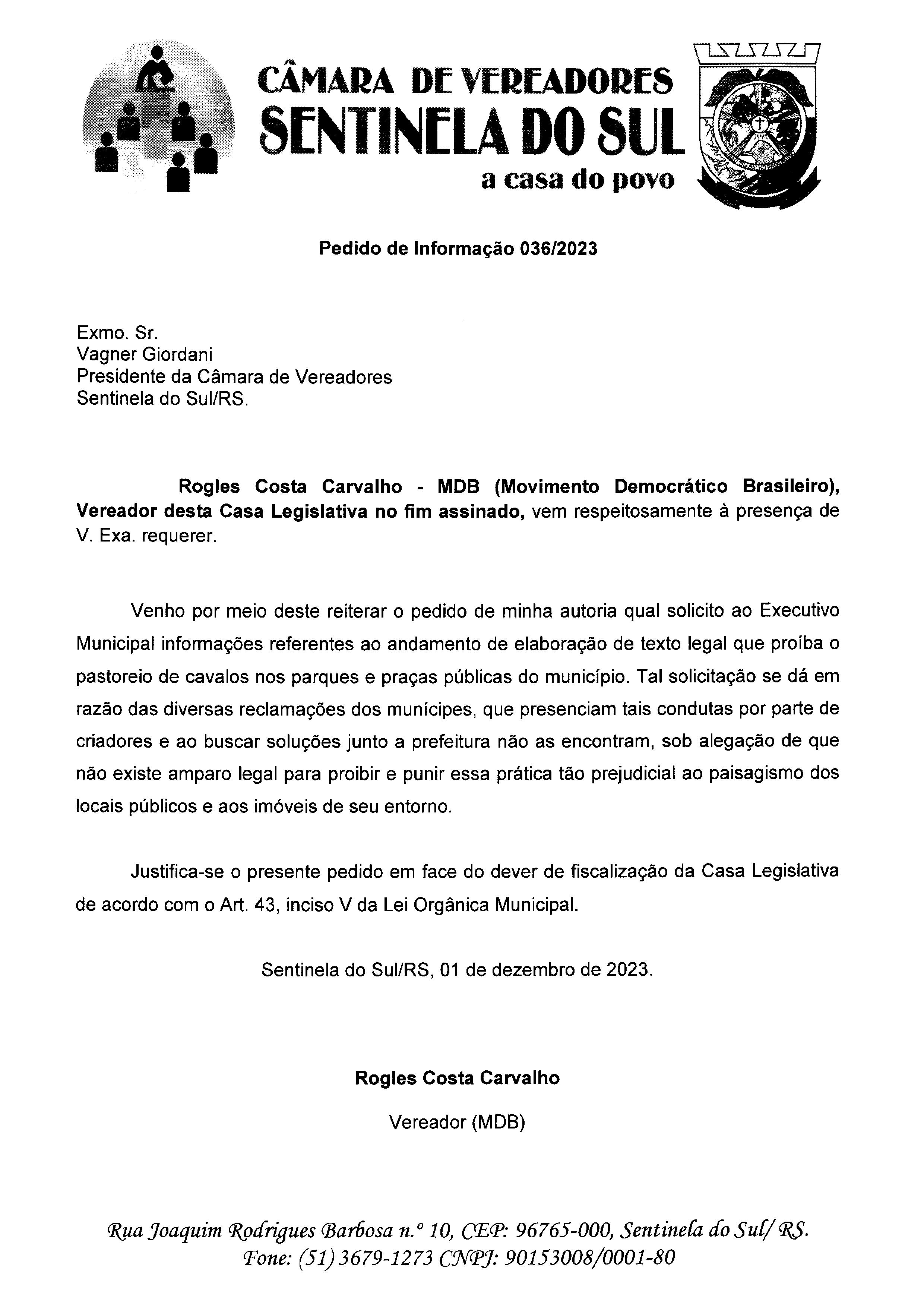 Pedido de Informação de autoria do Vereador Rogles Costa Carvalho