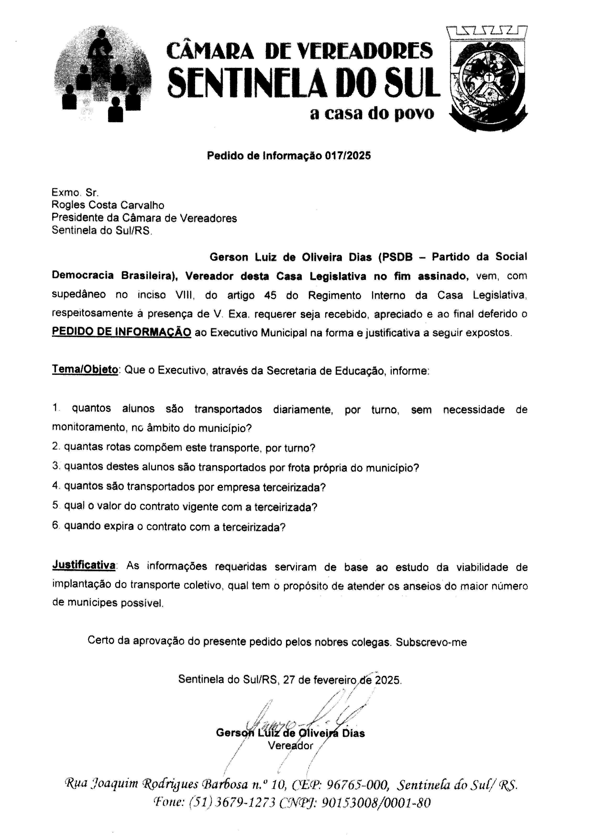 Autoria: Vereador Gerson Luiz de Oliveira Dias