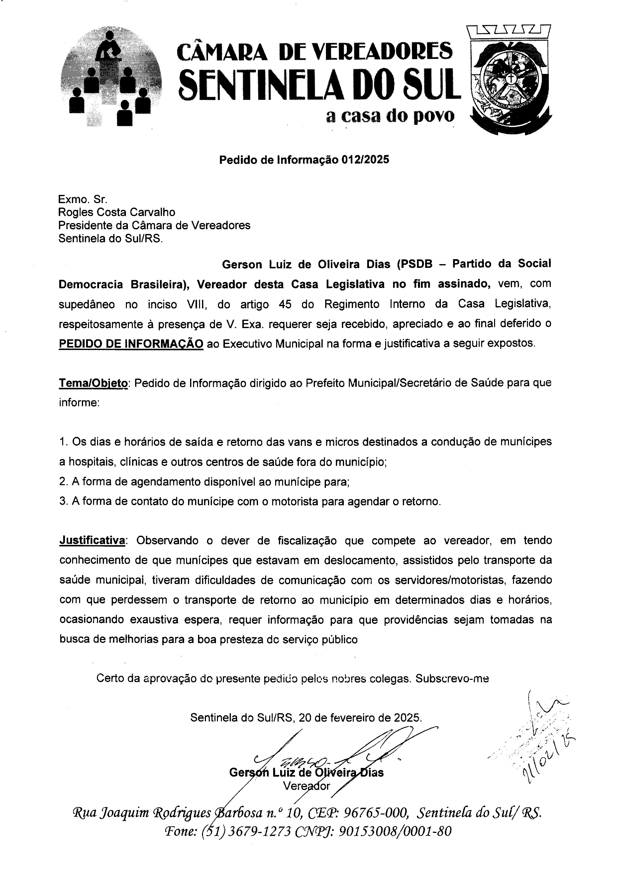 Pedido de Informação de autoria do Vereador Gerson Luiz de Oliveira Dias