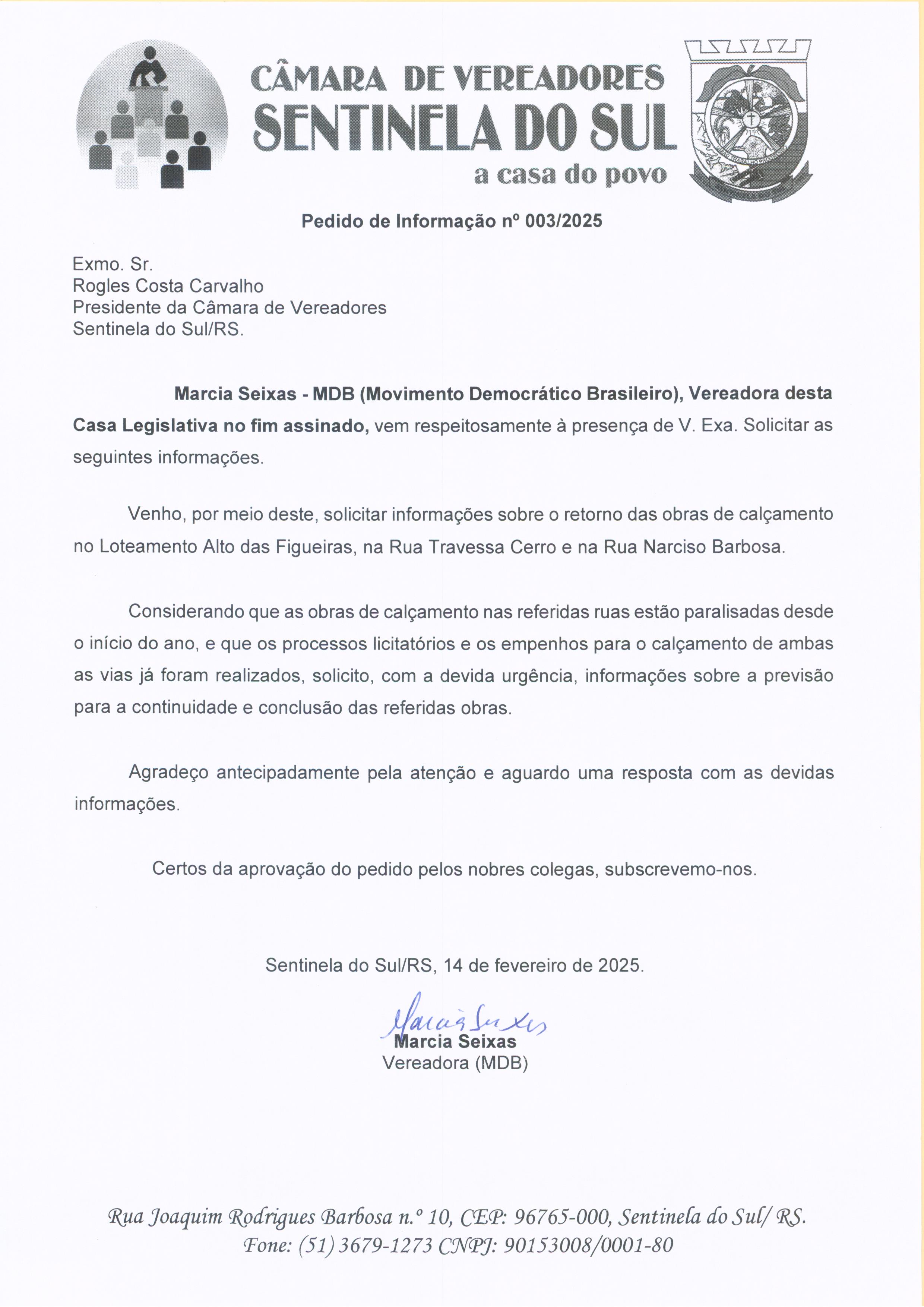 Pedido de Informação de autoria da Vereadora Marcia Seixas