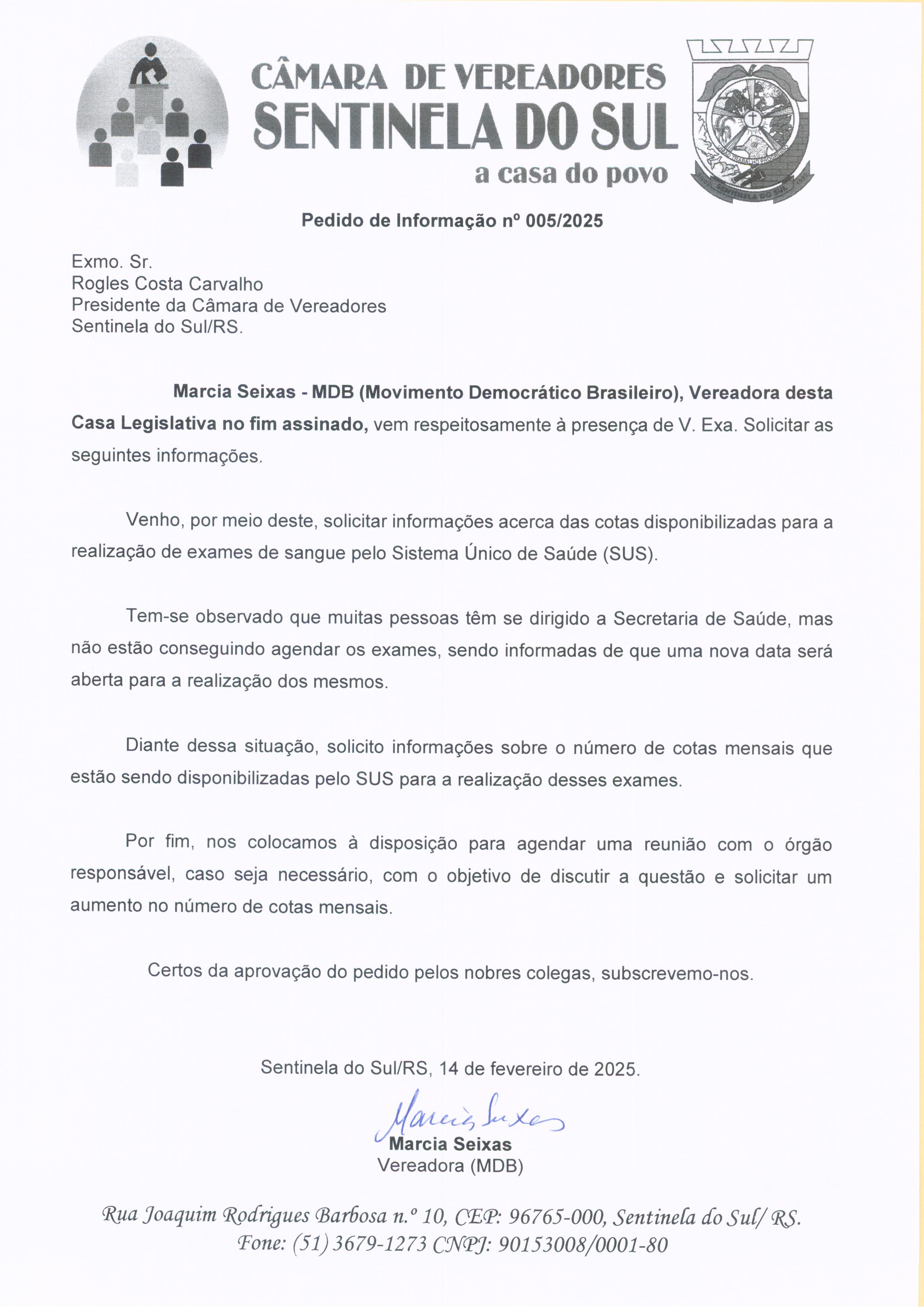 Pedido de Informação de autoria da Vereadora Marcia Seixas