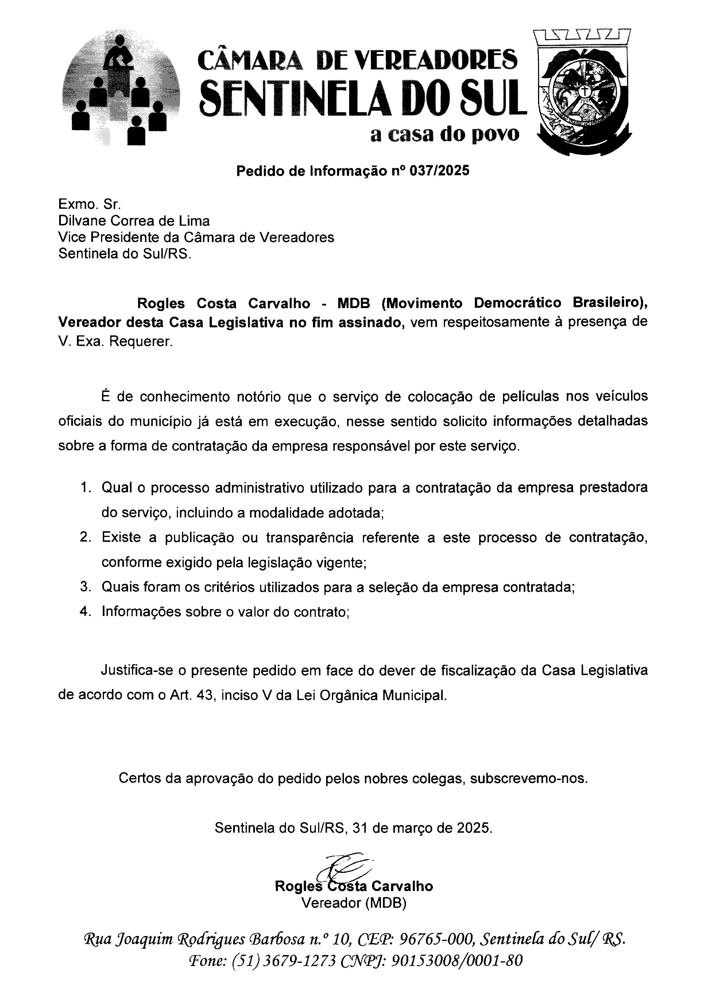 Assunto: Informações sobre o serviço de colocação de películas nos veículos oficiais do município