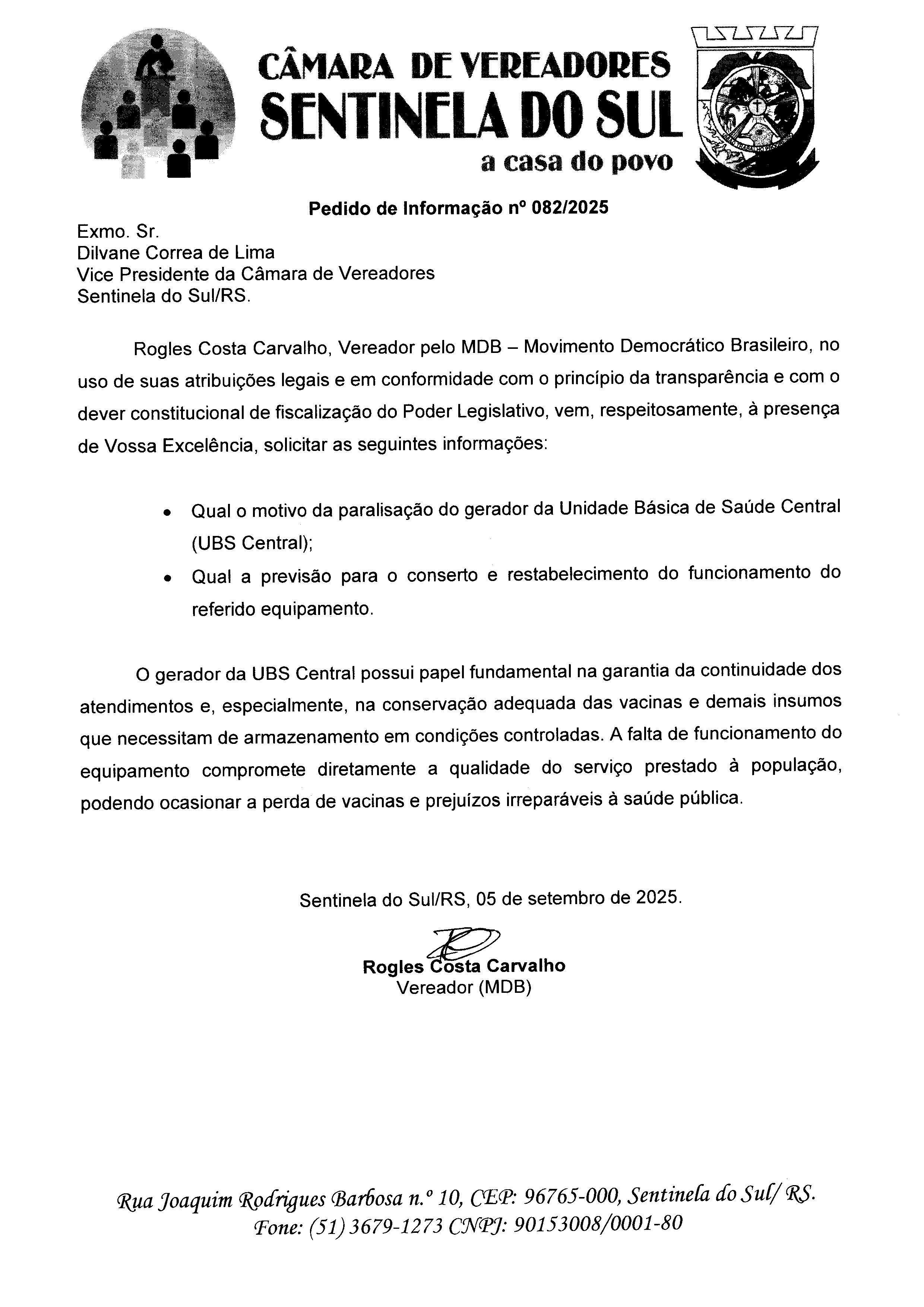 Assunto: Solicitar nformações sobre o gerador da Unidade Básica de Saúde Central (UBS Central)