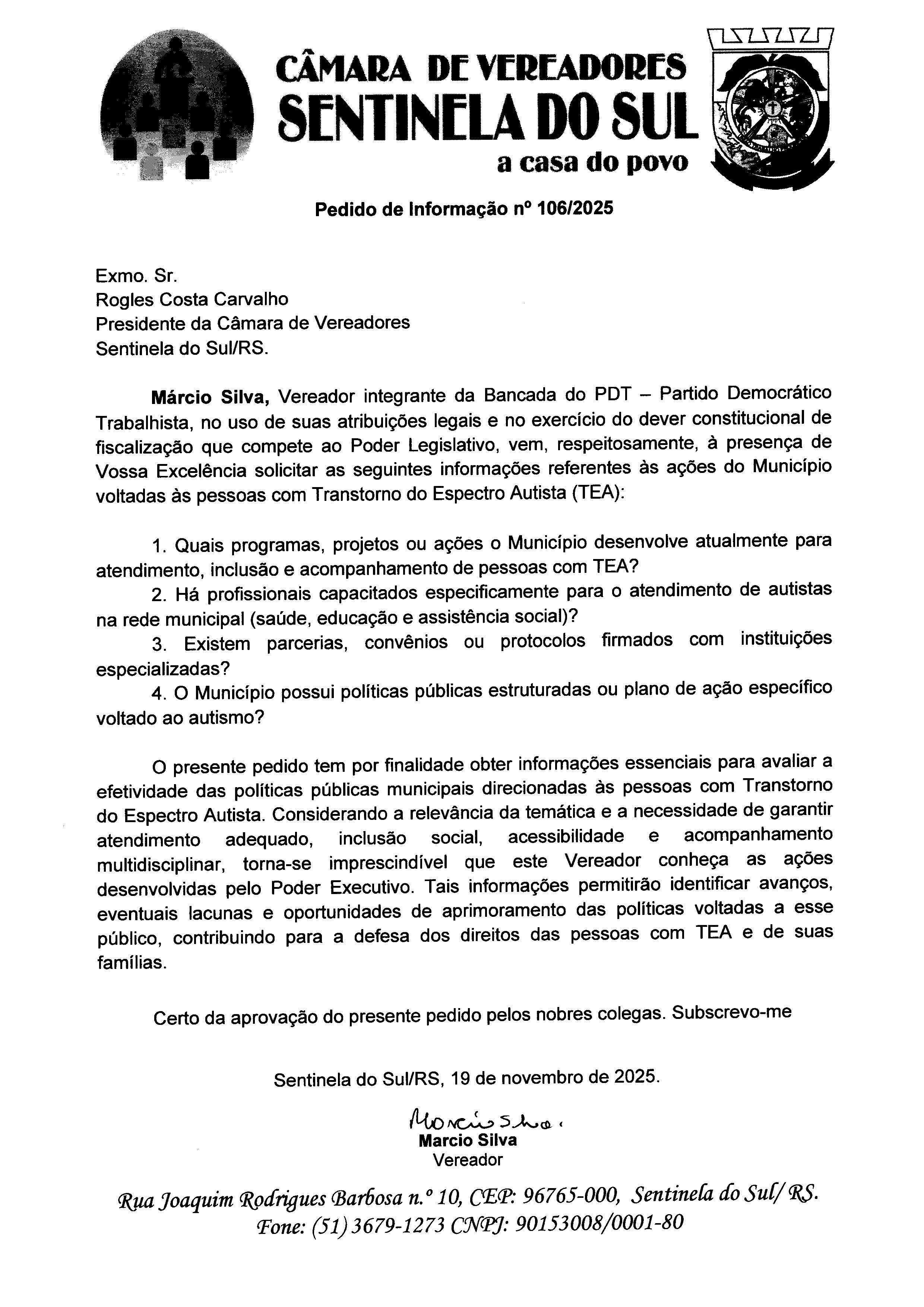 Assunto - Solicita informações referentes às ações do Município voltadas às pessoas com Transtorno do Espectro Autista (TEA)