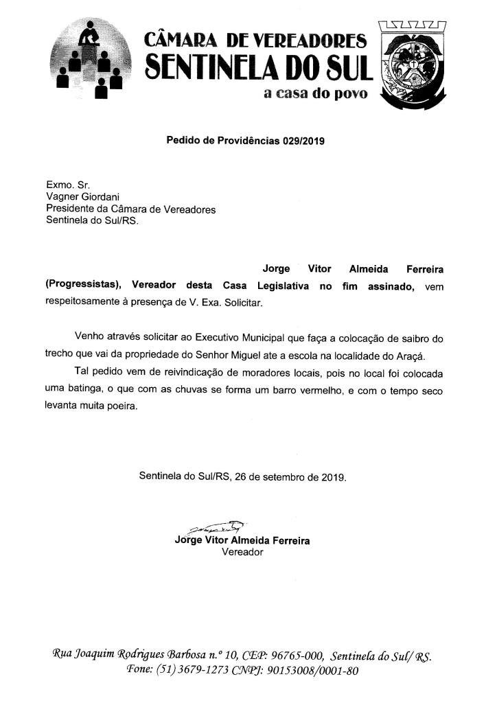 PEDIDO DE PROVIDÊNCIAS 029/2019