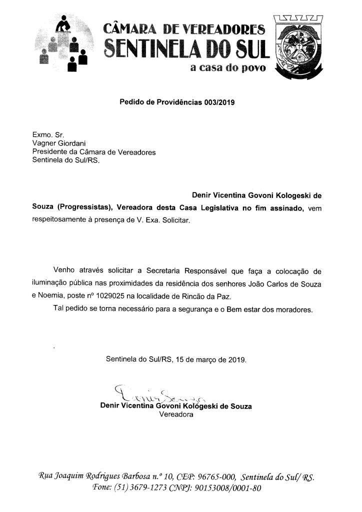 Pedido de Providências de autoria da Vereadora Denir Vicentina Govoni Kologeski de Souza