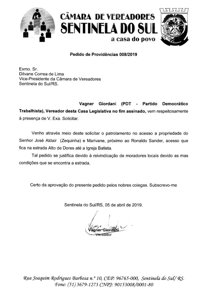 PEDIDO DE PROVIDÊNCIAS 008/2019