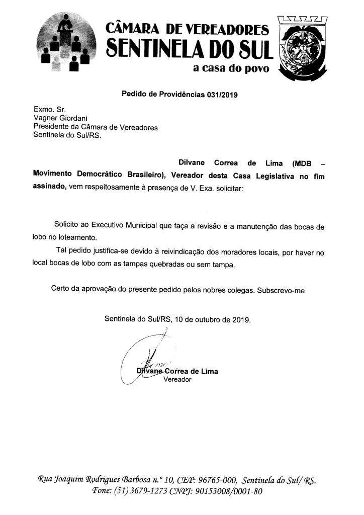 PEDIDO DE PROVIDÊNCIAS 031/2019