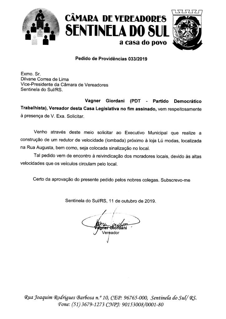 PEDIDO DE PROVIDÊNCIAS 033/2019