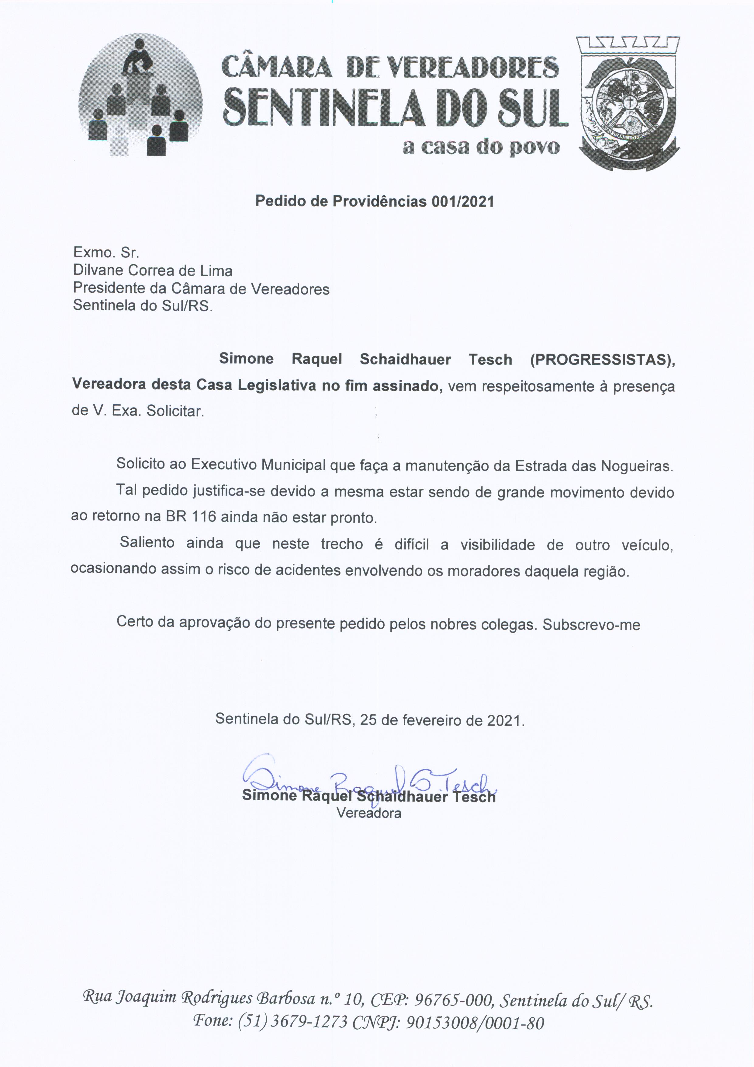 Pedido de Providências de autoria da vereadora Simone Raquel Schaidhauer Tesch