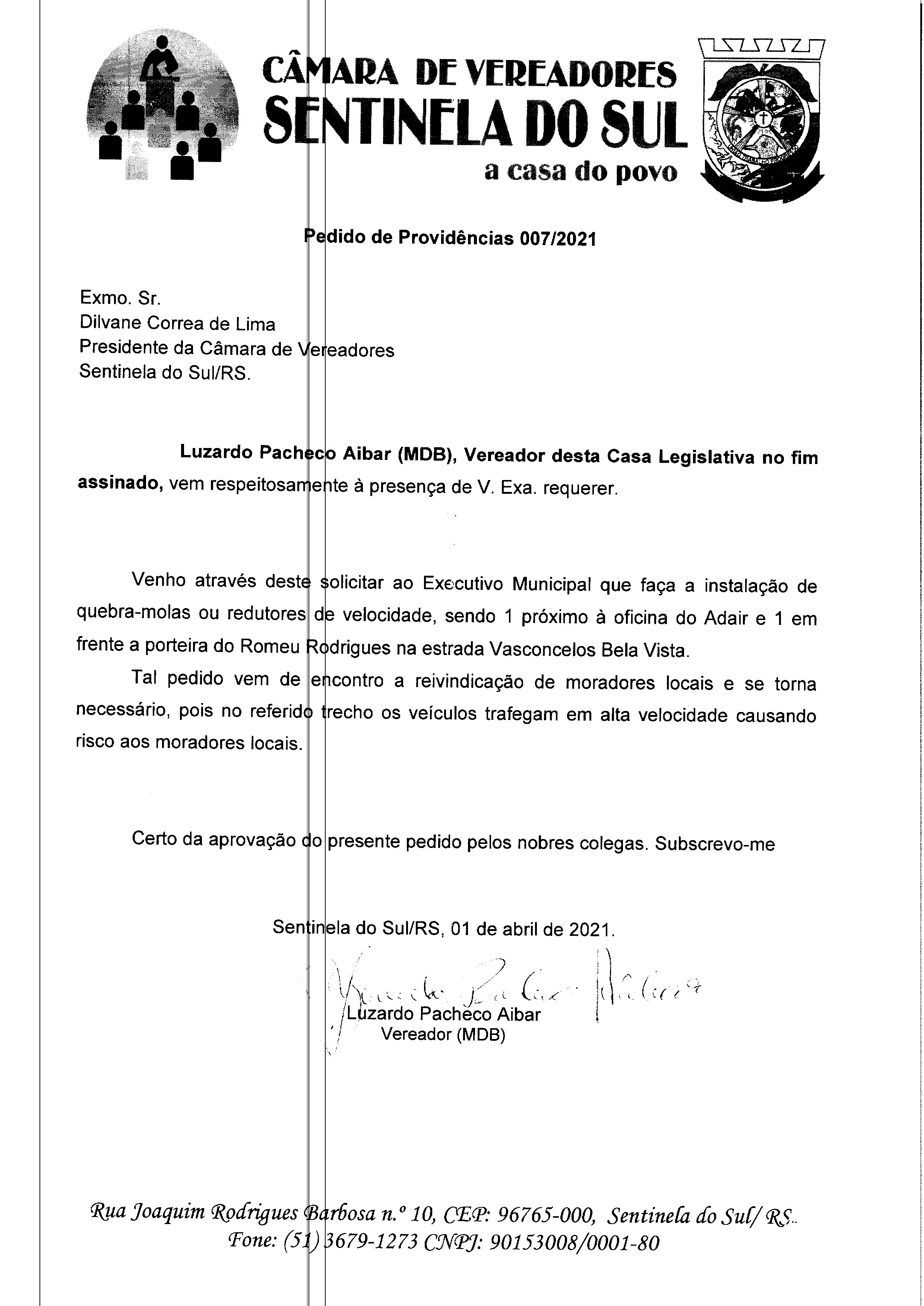 Pedido de Providências de autoria do Vereador Luzardo Pacheco Aibar