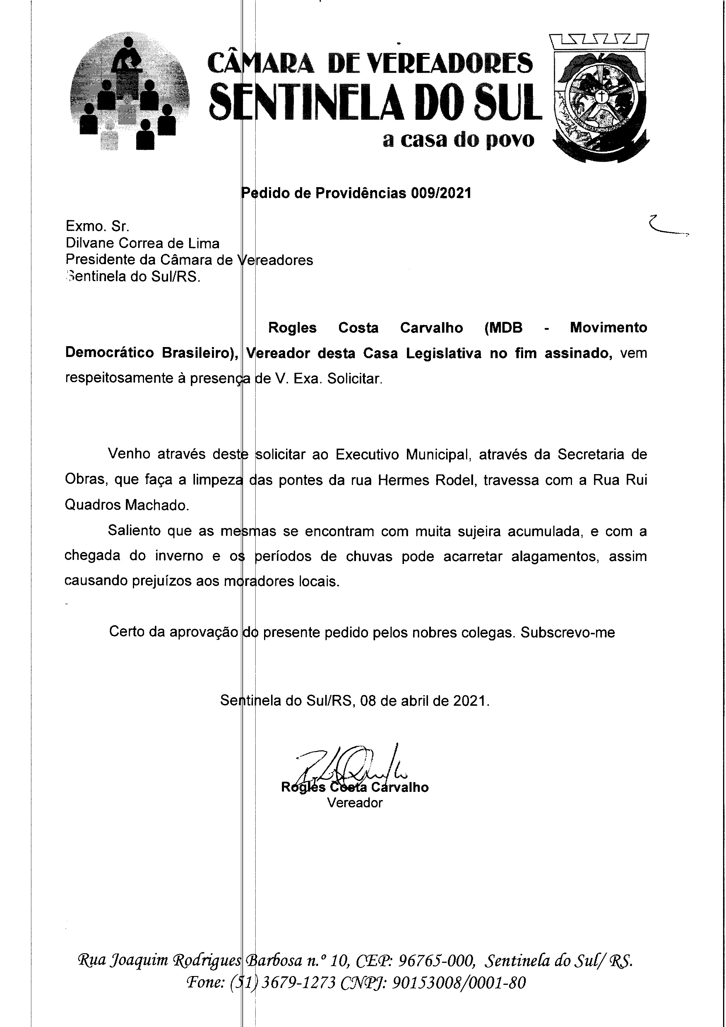 Pedido de Providências de autoria do Vereador Rogles Costa Carvalho