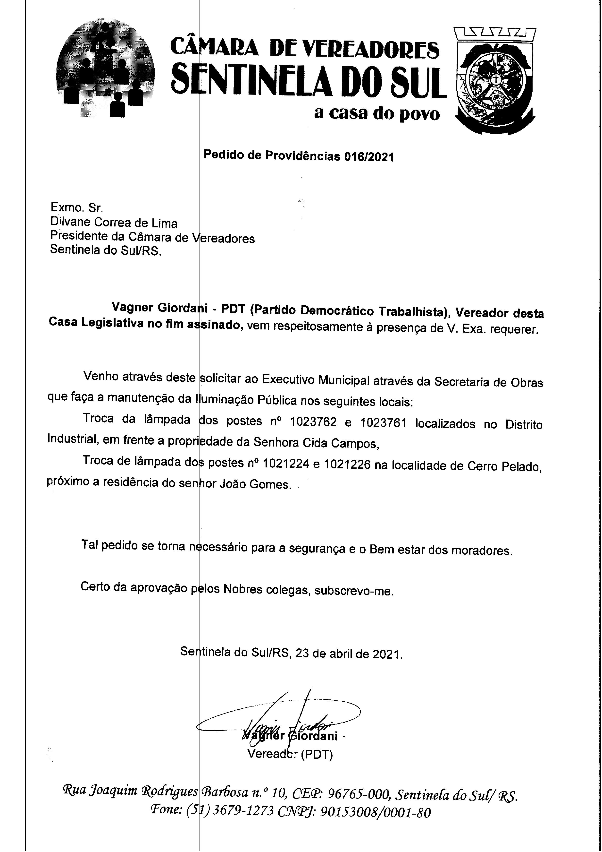 Pedido de Providências de autoria do vereador Vagner Giordani