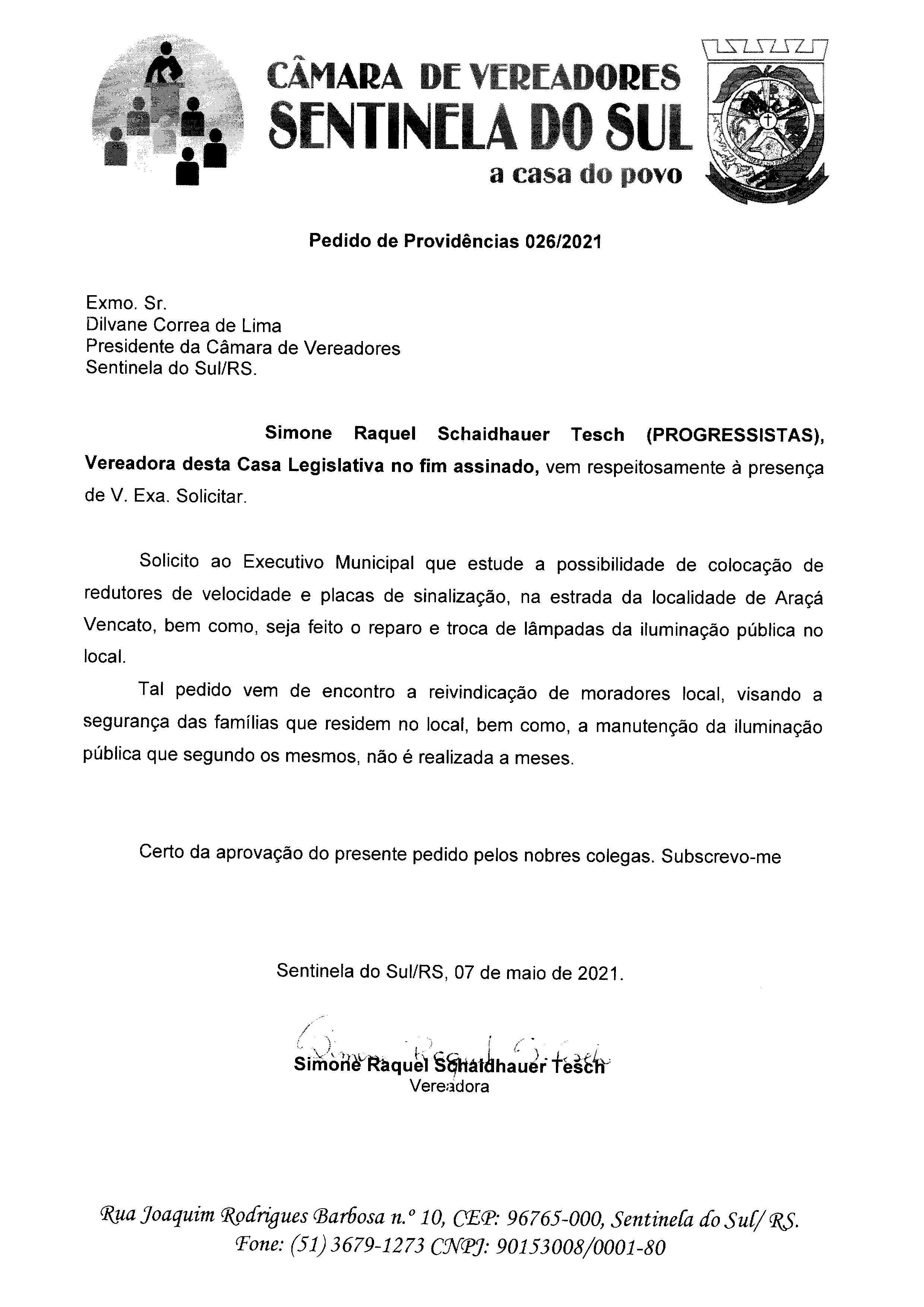 Pedido de Providências de autoria da Vereadora Simone Raquel Schaidhauer Tesch
