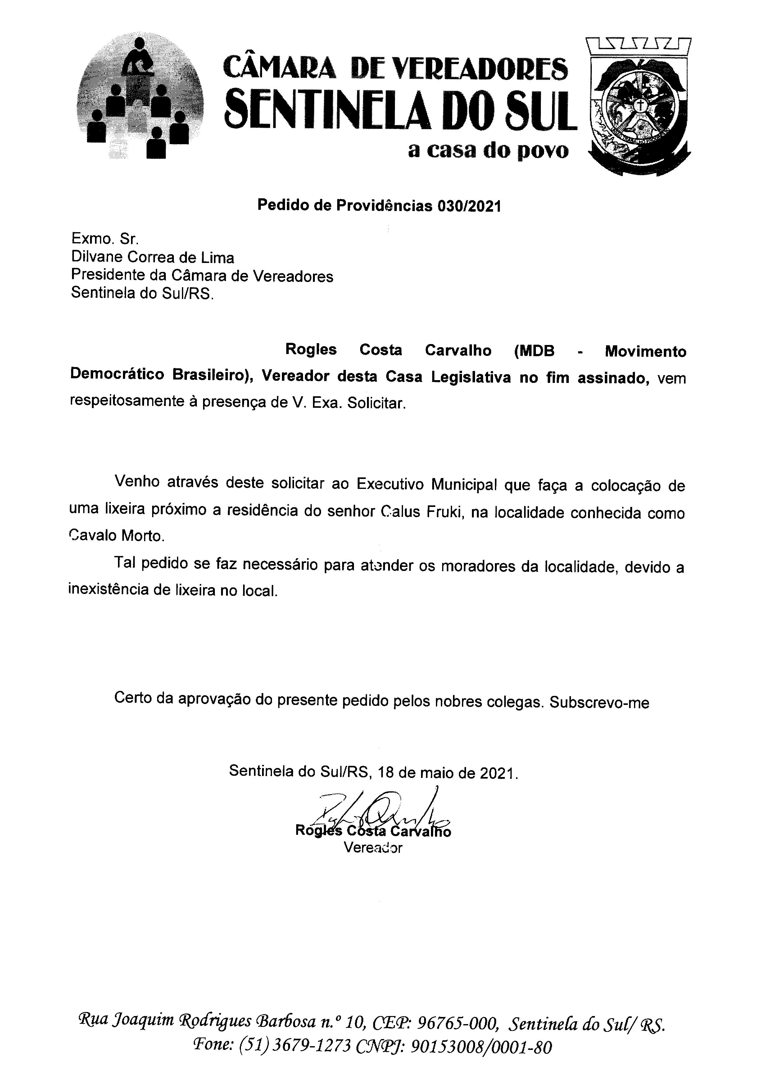 Pedido de Providências de autoria do Vereador Rogles Costa Carvalho