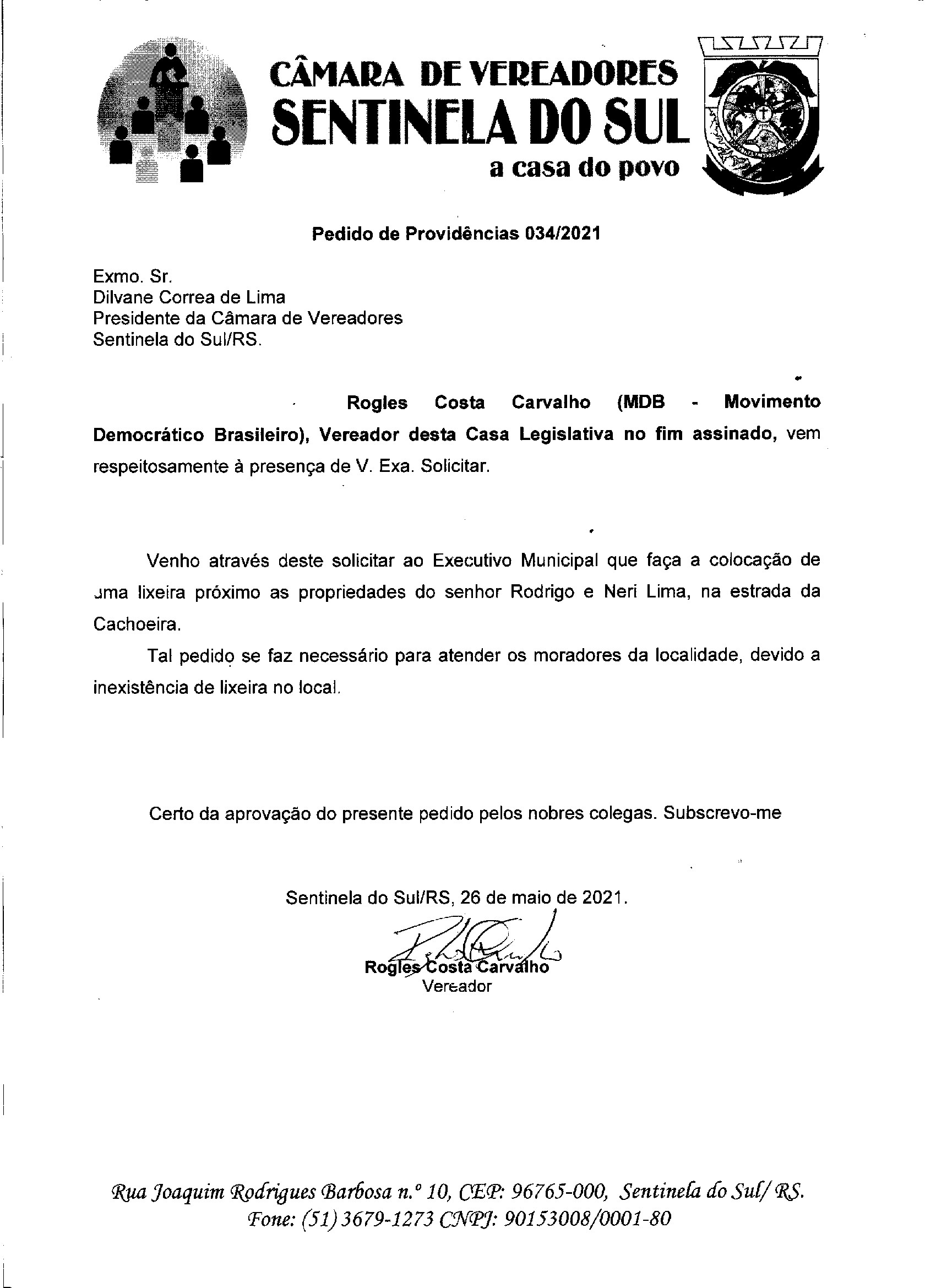 Pedido de Providências de autoria do vereador Rogles Costa Carvalho