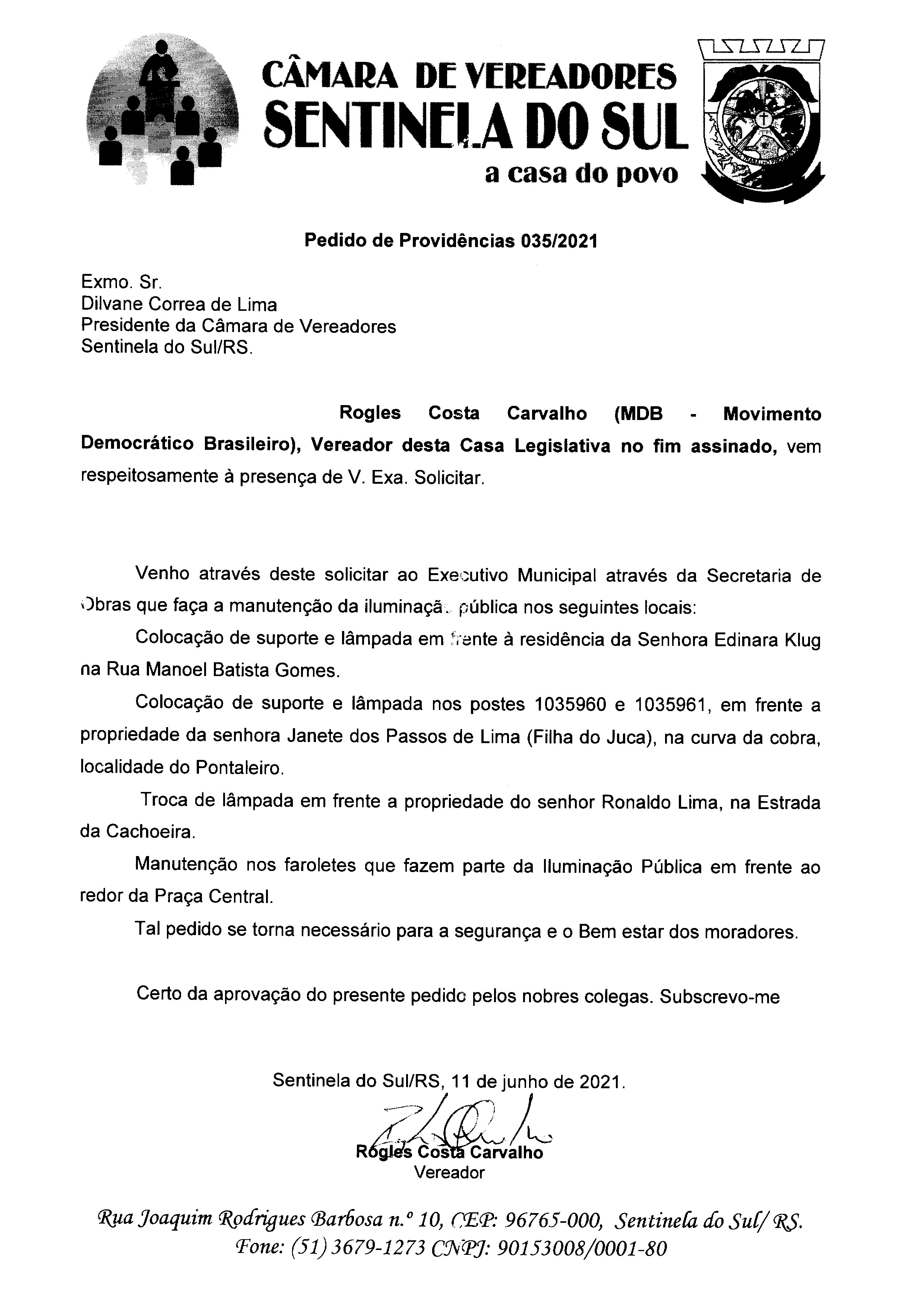 Pedido de Providências de autoria do vereador Rogles Costa Carvalho