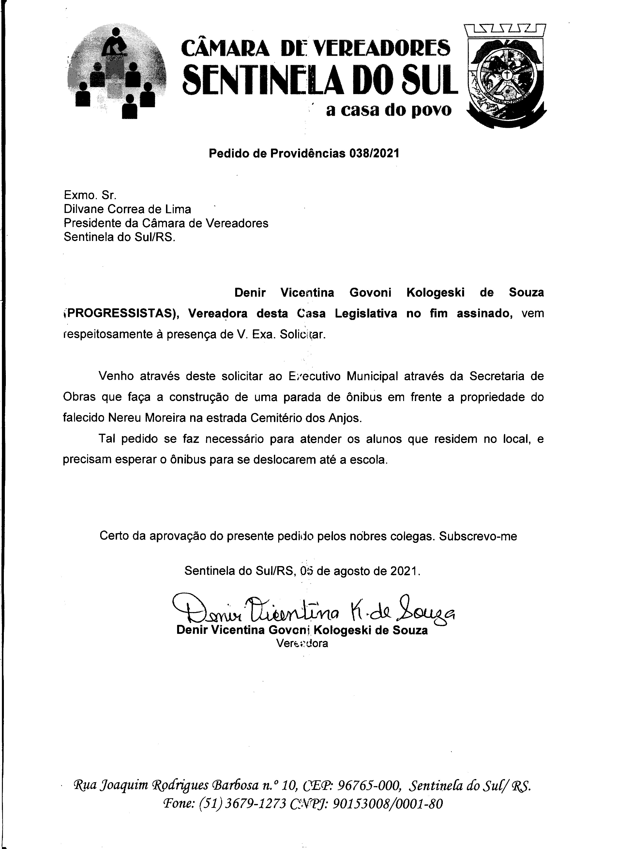 Pedido de Providências de autoria da Vereadora Denir Vicentina Govoni Kologeski de Souza