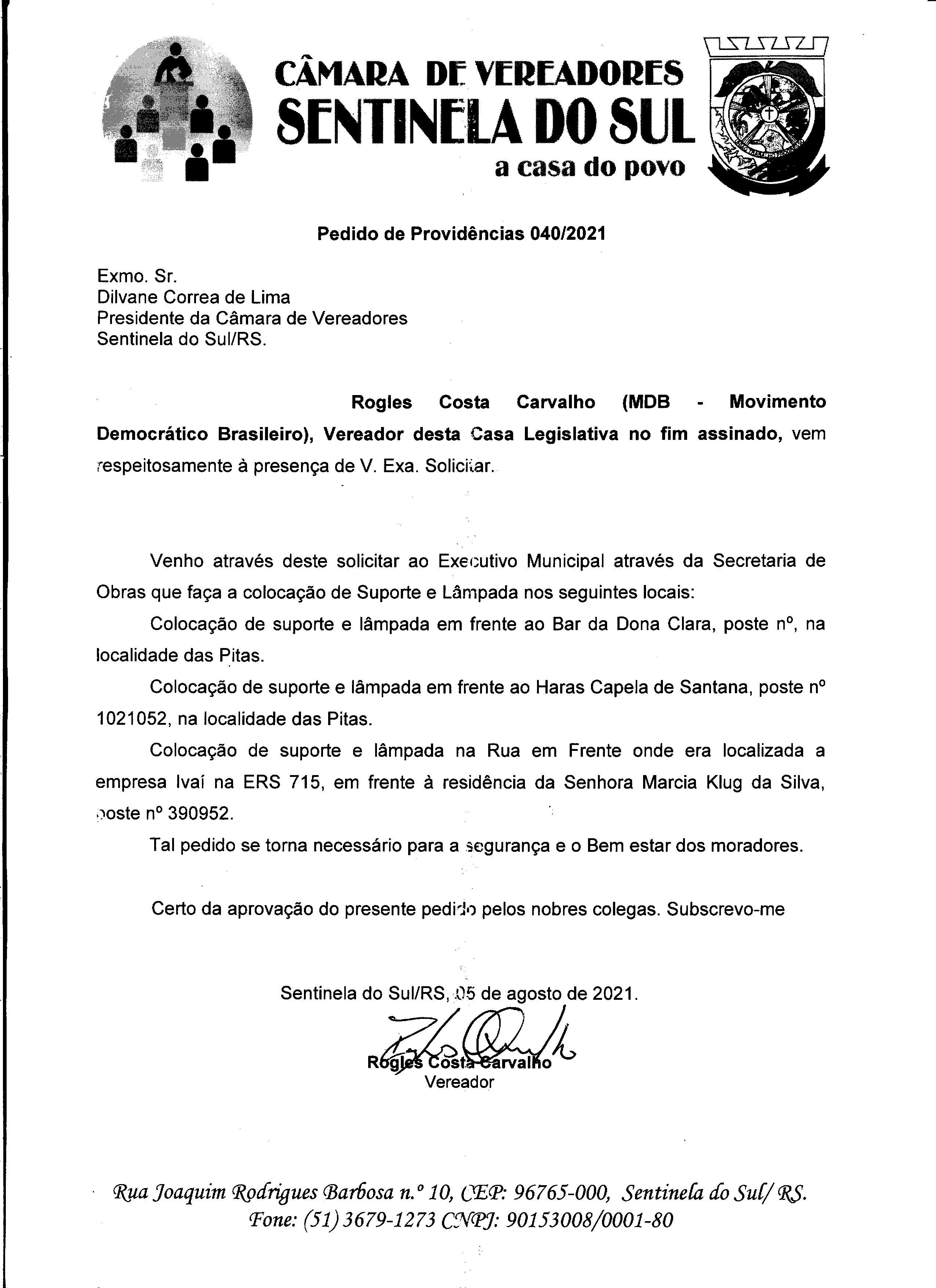 Pedido de Providências de autoria do Vereador Rogles Costa Carvalho