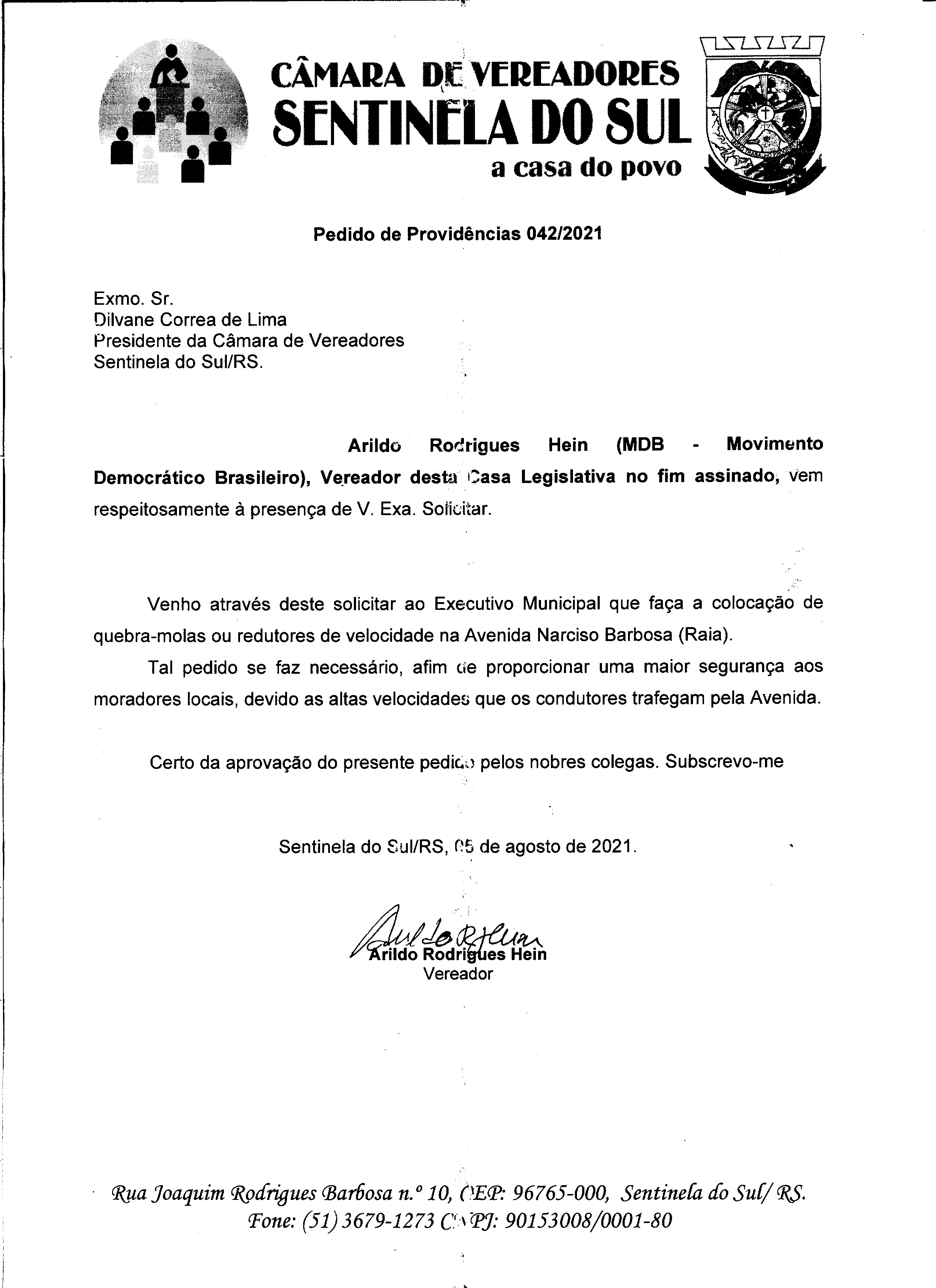 Pedido de Providências de autoria do Vereador Arildo Rodrigues Hein