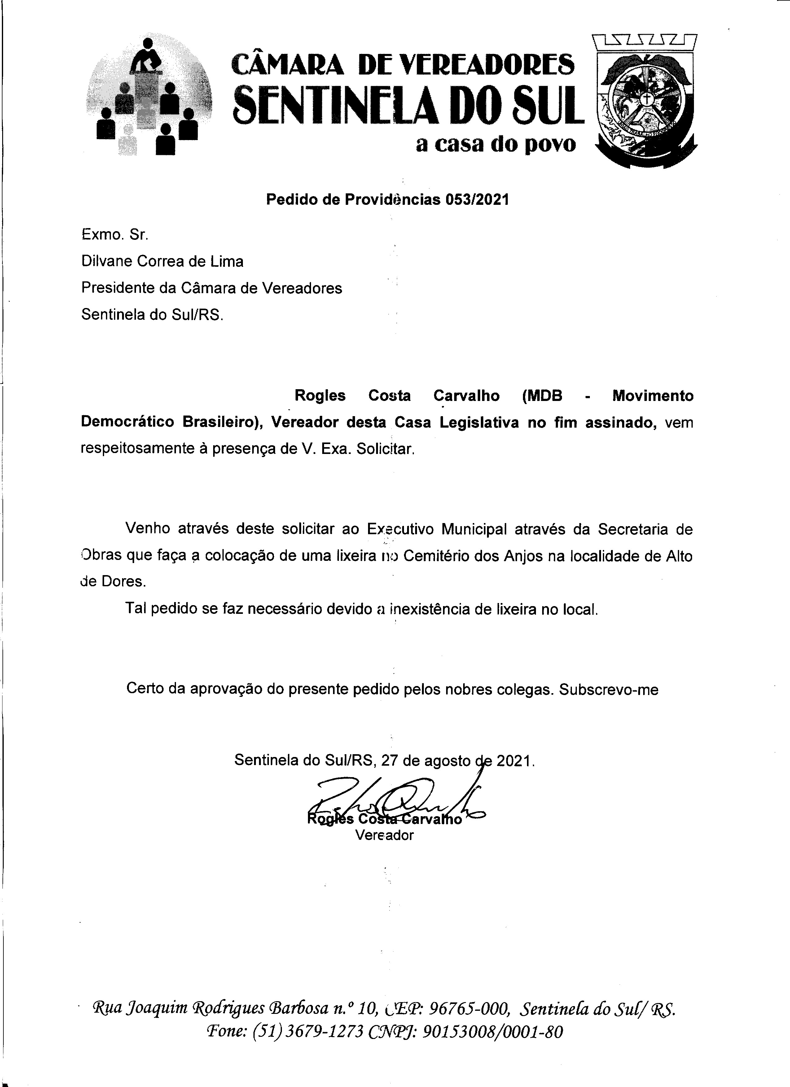 Pedido de Providências de autoria do vereador Rogles Costa Carvalho
