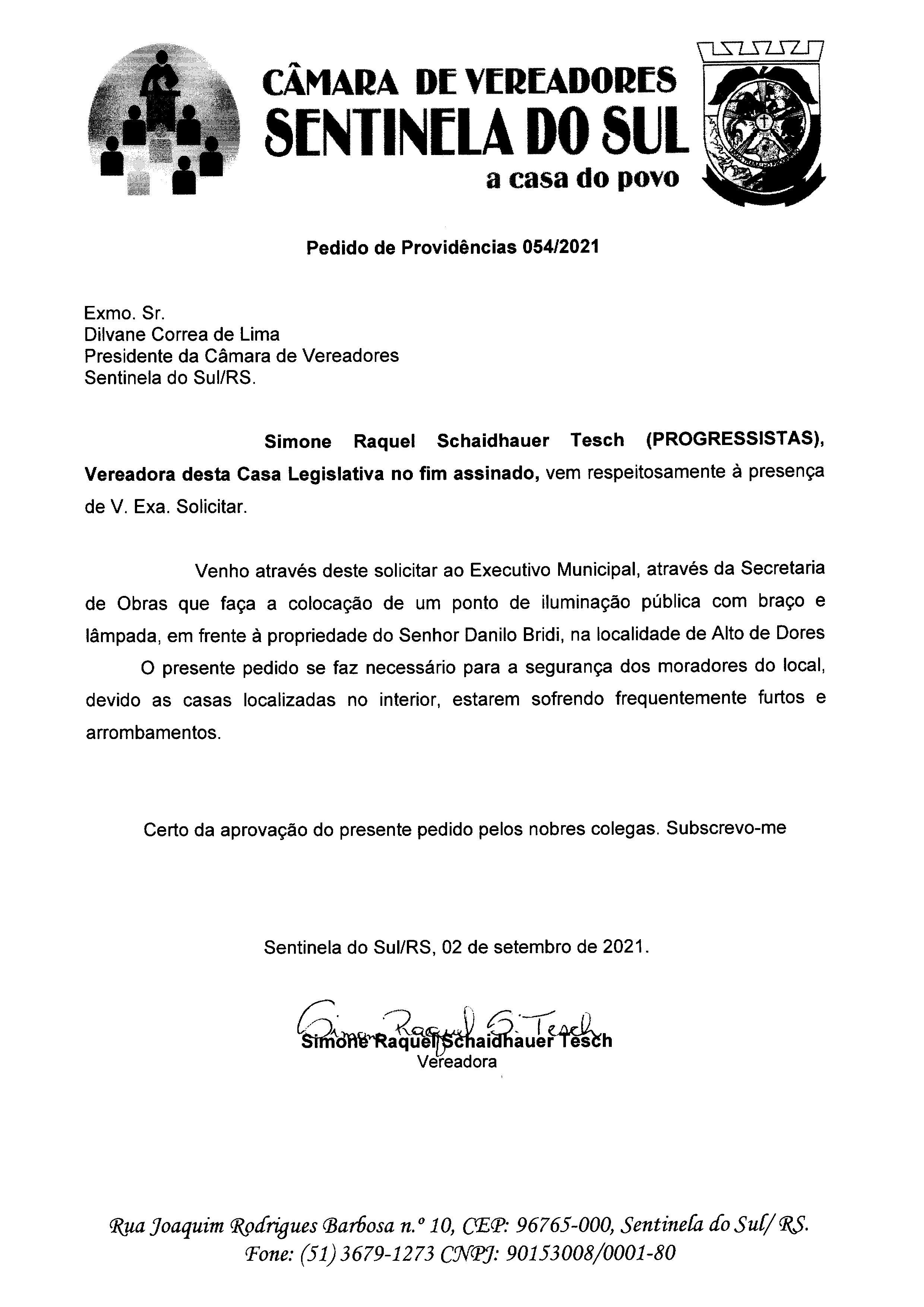 Pedido de Providências de autoria da Vereadora Simone Raquel Schaidhauer Tesch