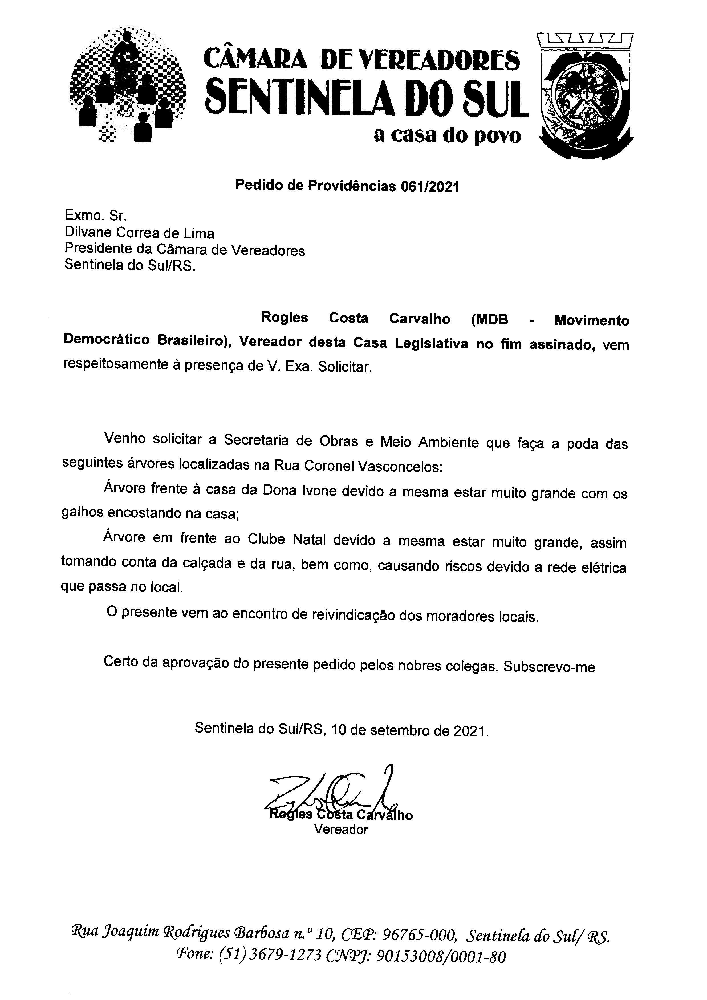 Pedido de Providências de autoria do vereador Rogles Costa Carvalho