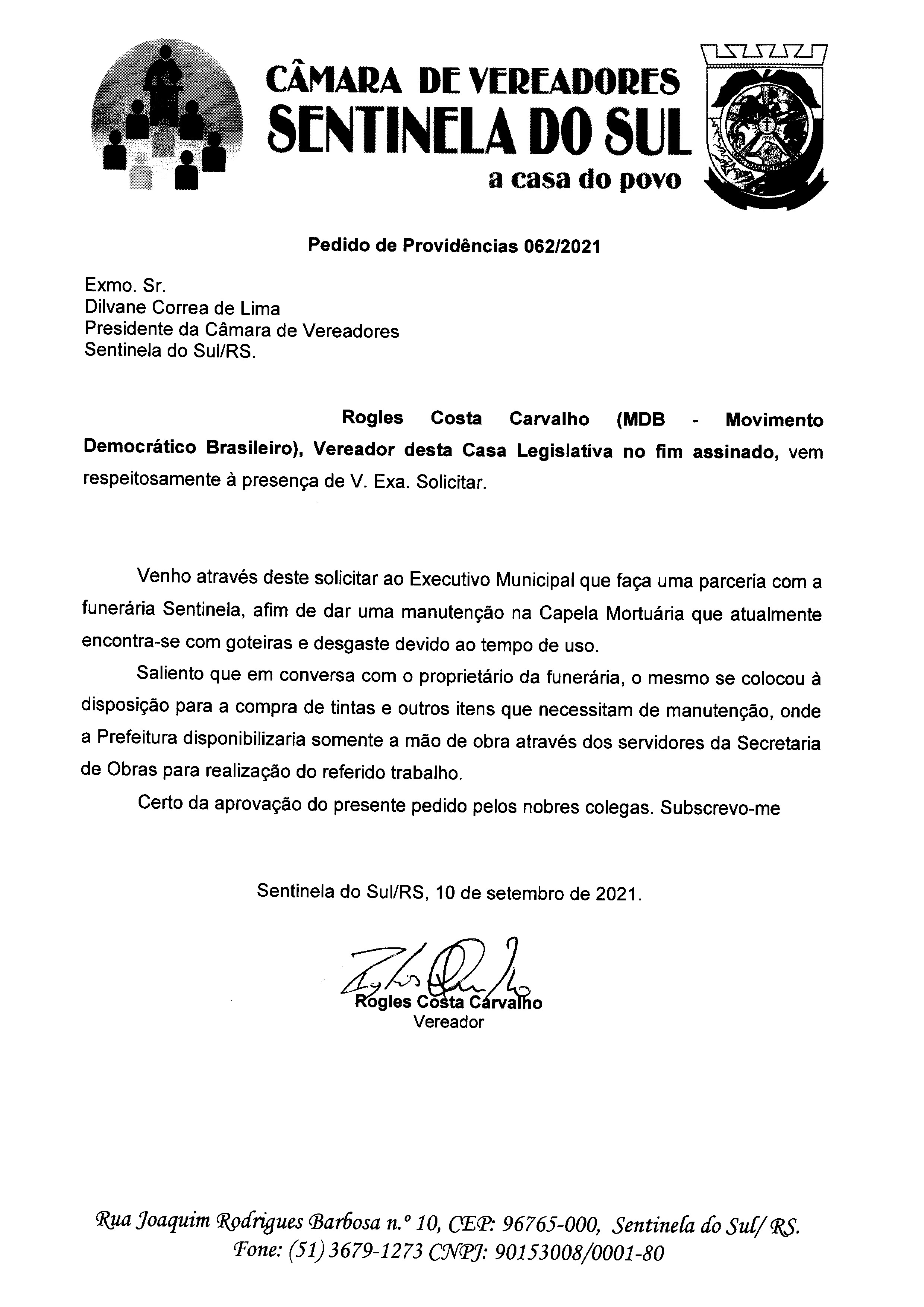 Pedido de Providências de autoria do vereador Rogles Costa Carvalho