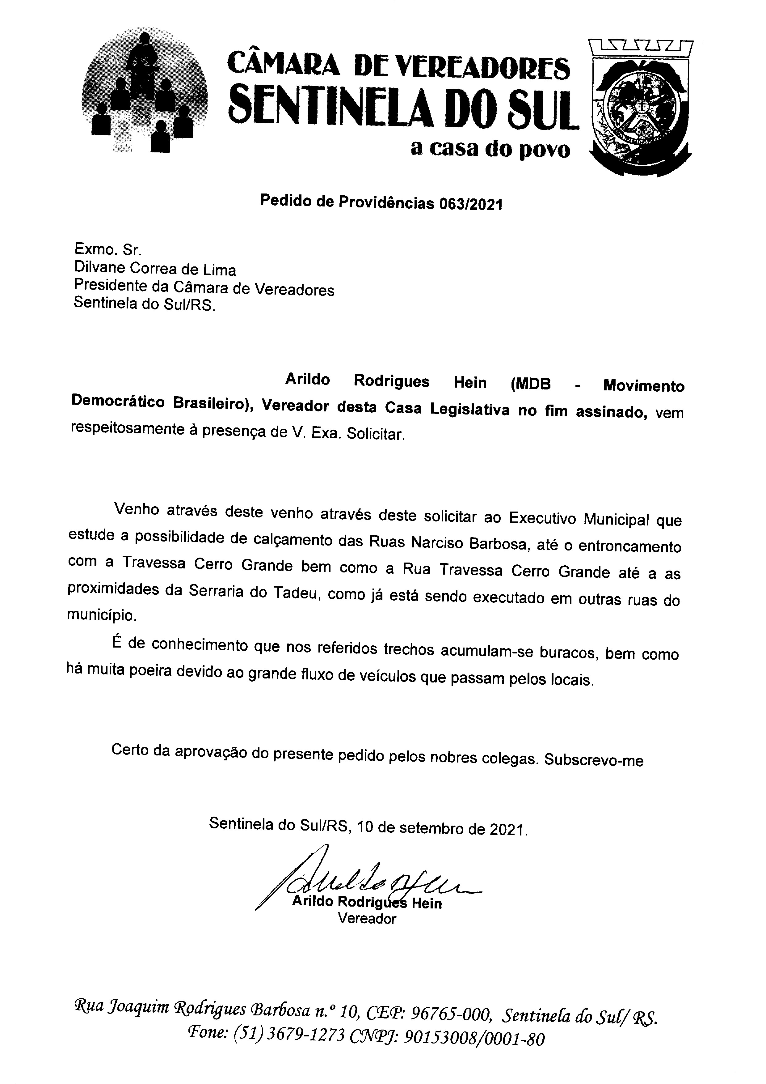 Pedido de Providências de autoria do vereador Arildo Rodrigues Hein