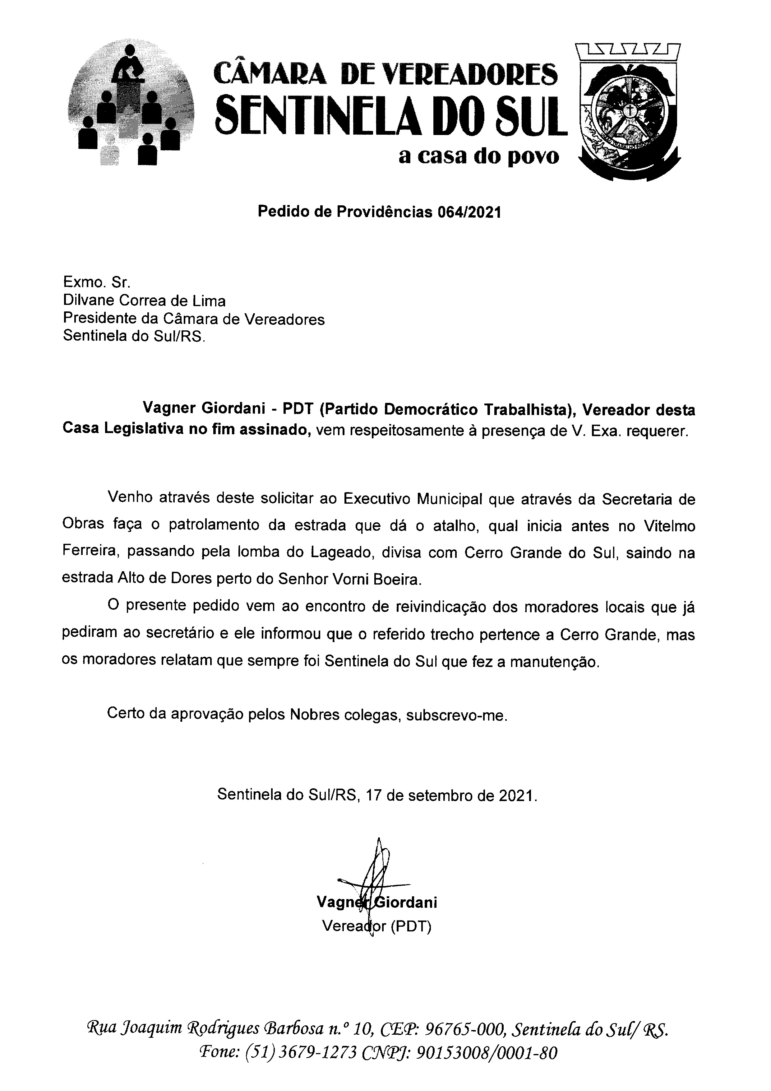 Pedido de Providências de autoria do Vereador Vagner Giordani