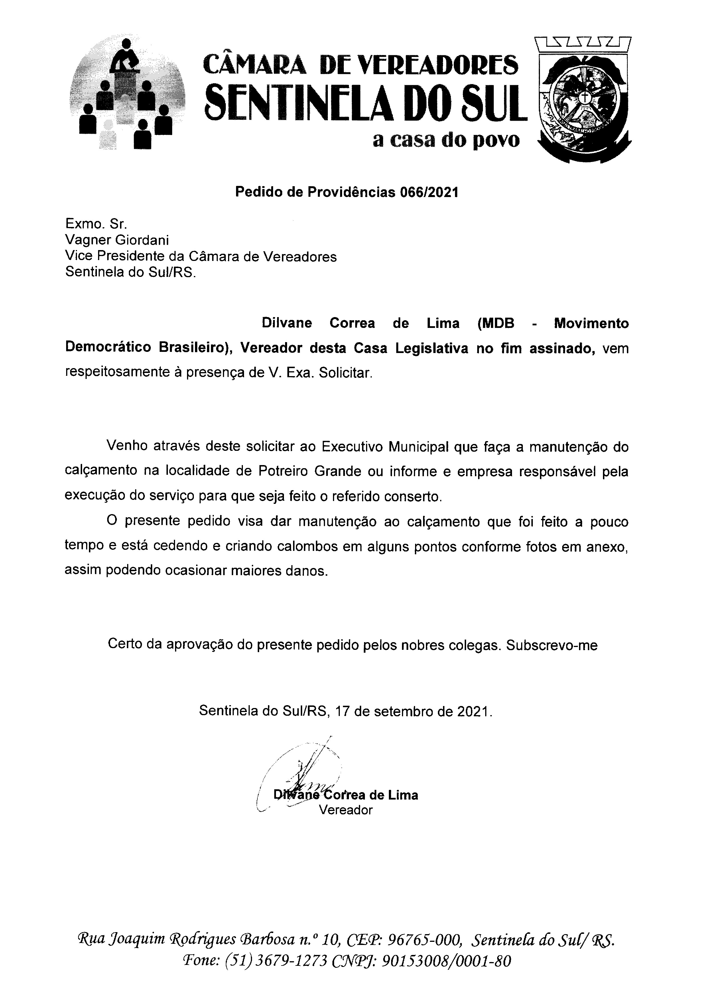 Pedido de Providências de autoria do Vereador Dilvane Correa de Lima