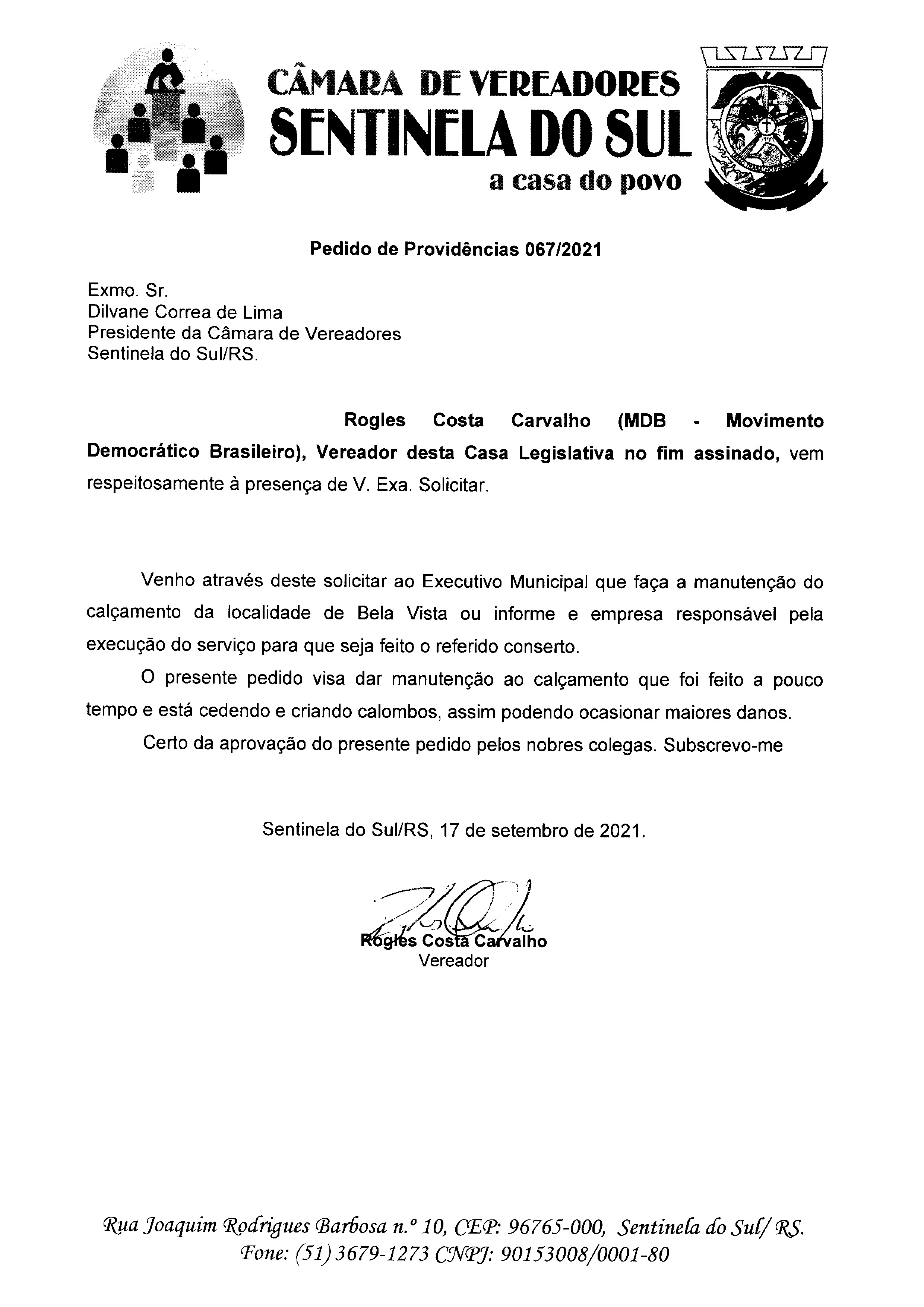 Pedido de Providências de autoria do Vereador Rogles Costa Carvalho