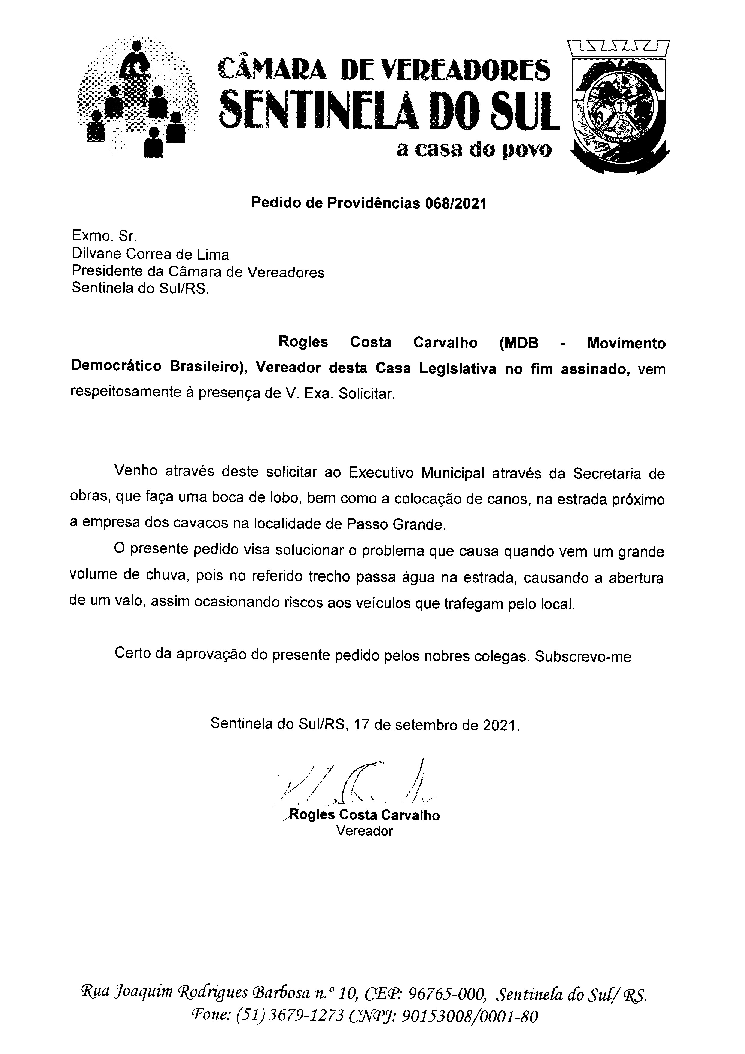 Pedido de Providências de autoria do Vereador Rogles Costa Carvalho