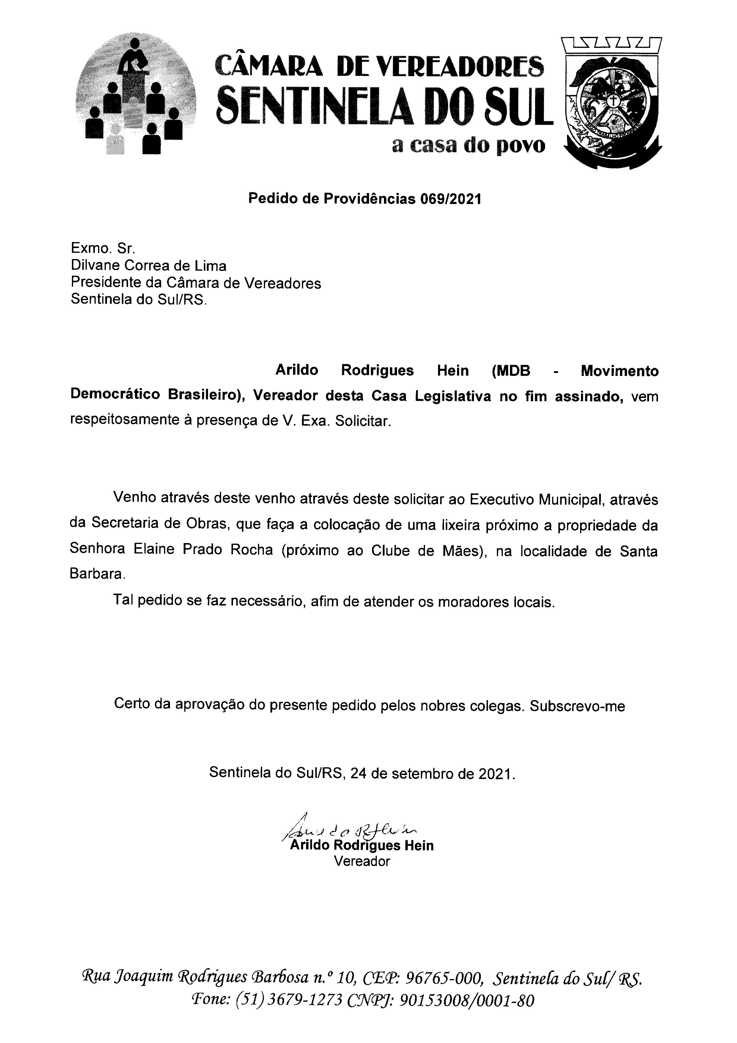Pedido de Providências de autoria do vereador Arildo Rodrigues Hein