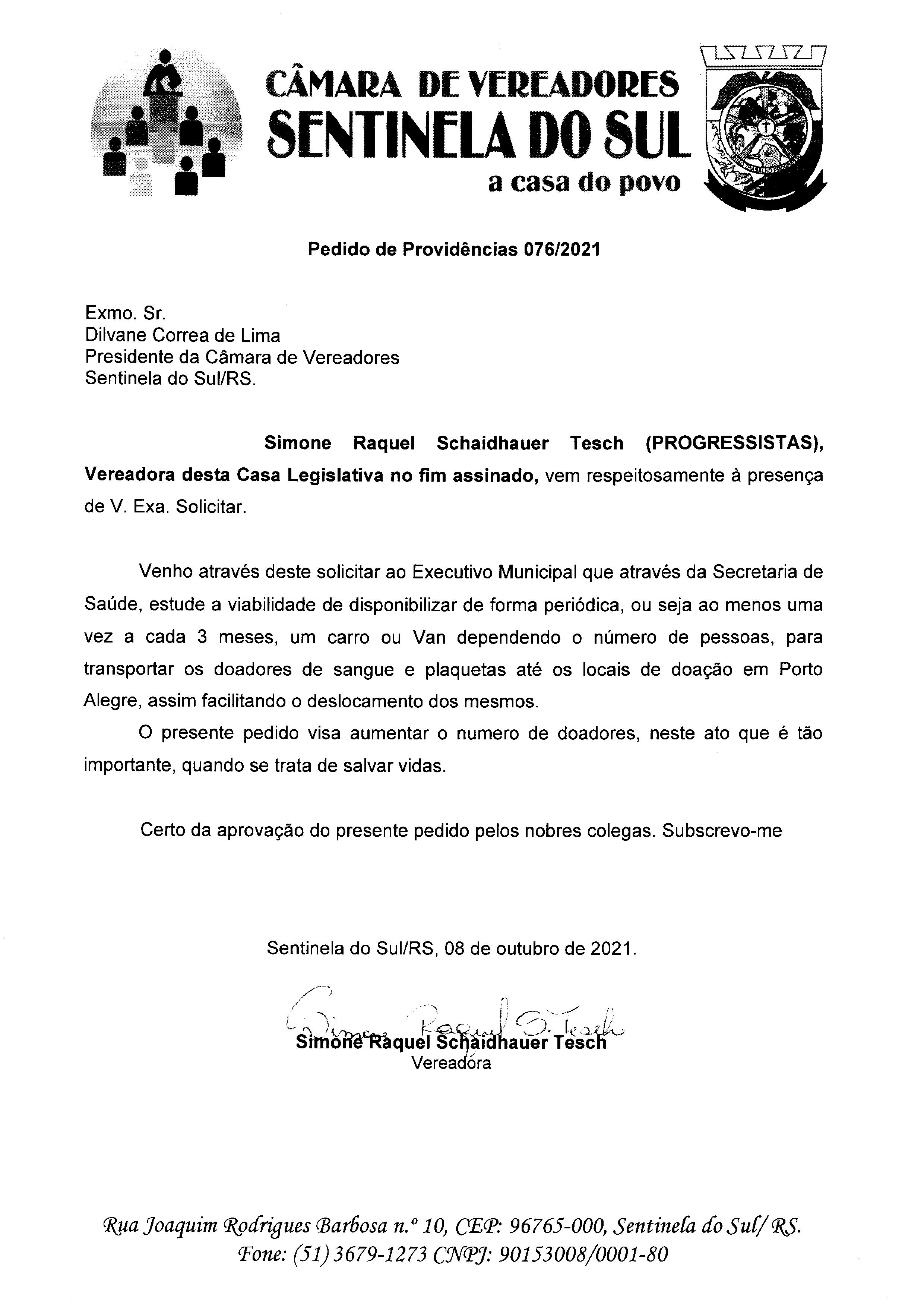 Pedido de Providências de autoria da Vereadora Simone Raquel Schaidhauer Tesch