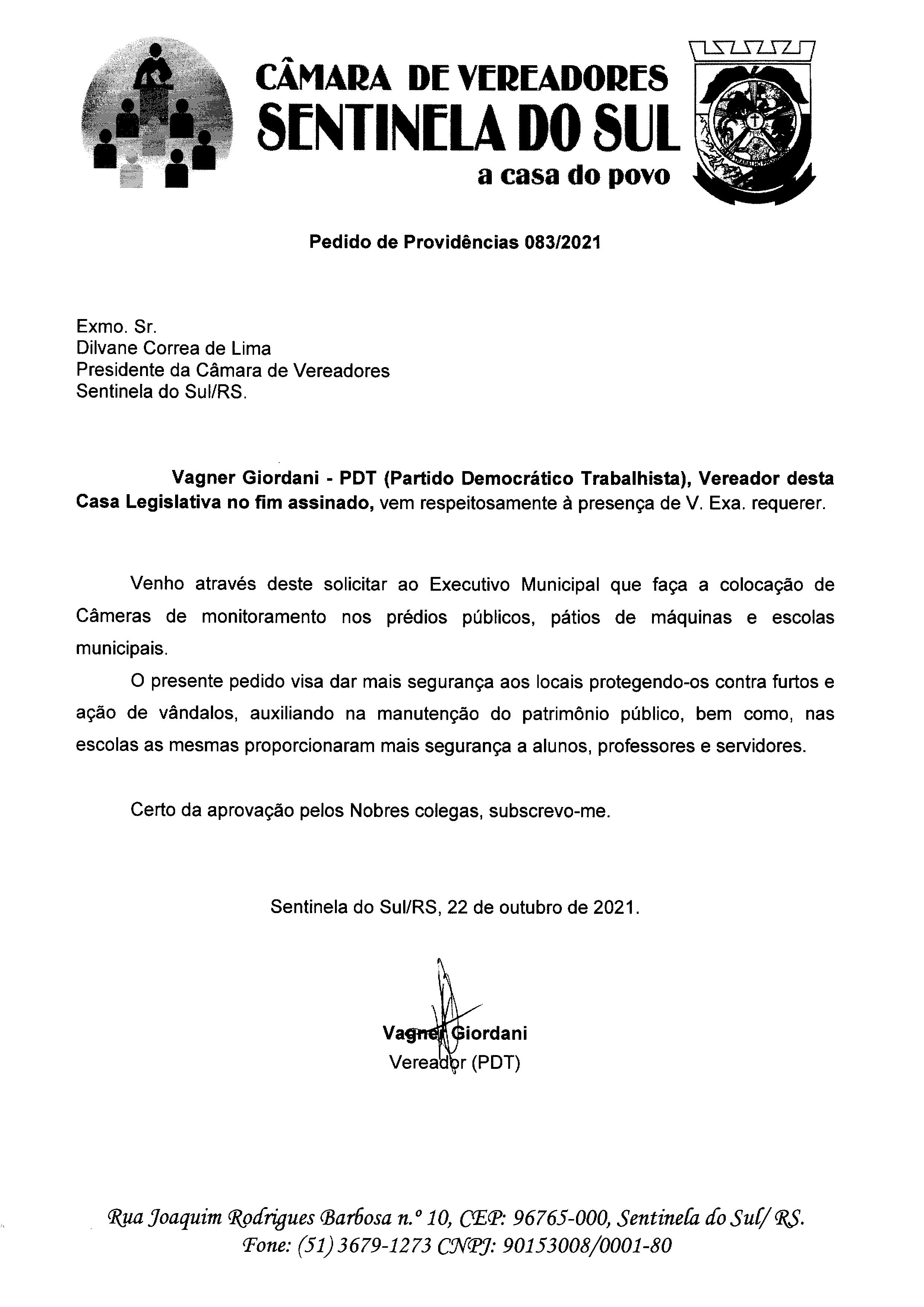 Pedido de Providências de autoria do Vereador Vagner Giordani