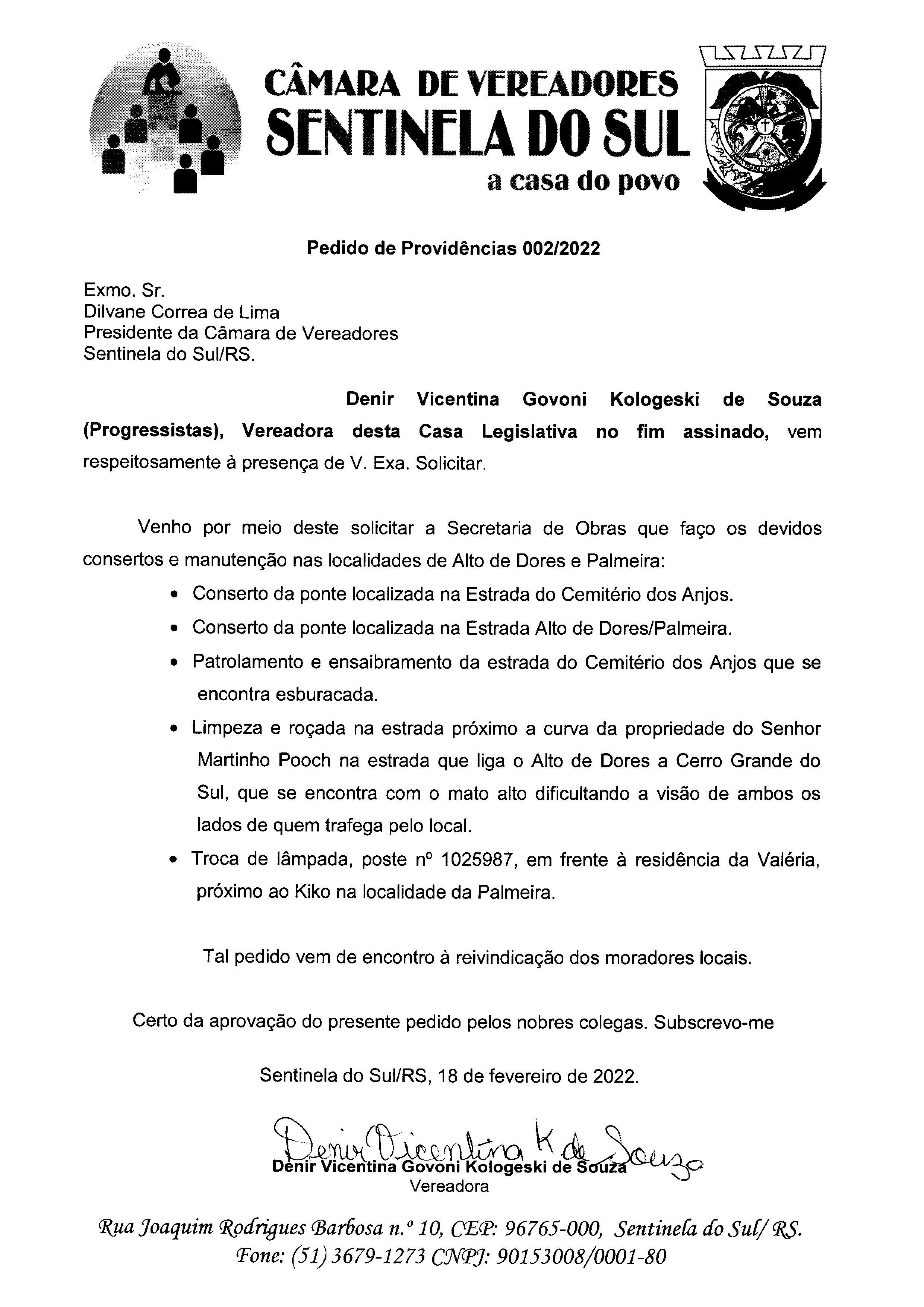 Pedido de Providências de autoria da Vereadora Denir Vicentina Govoni Kologeski de Souza