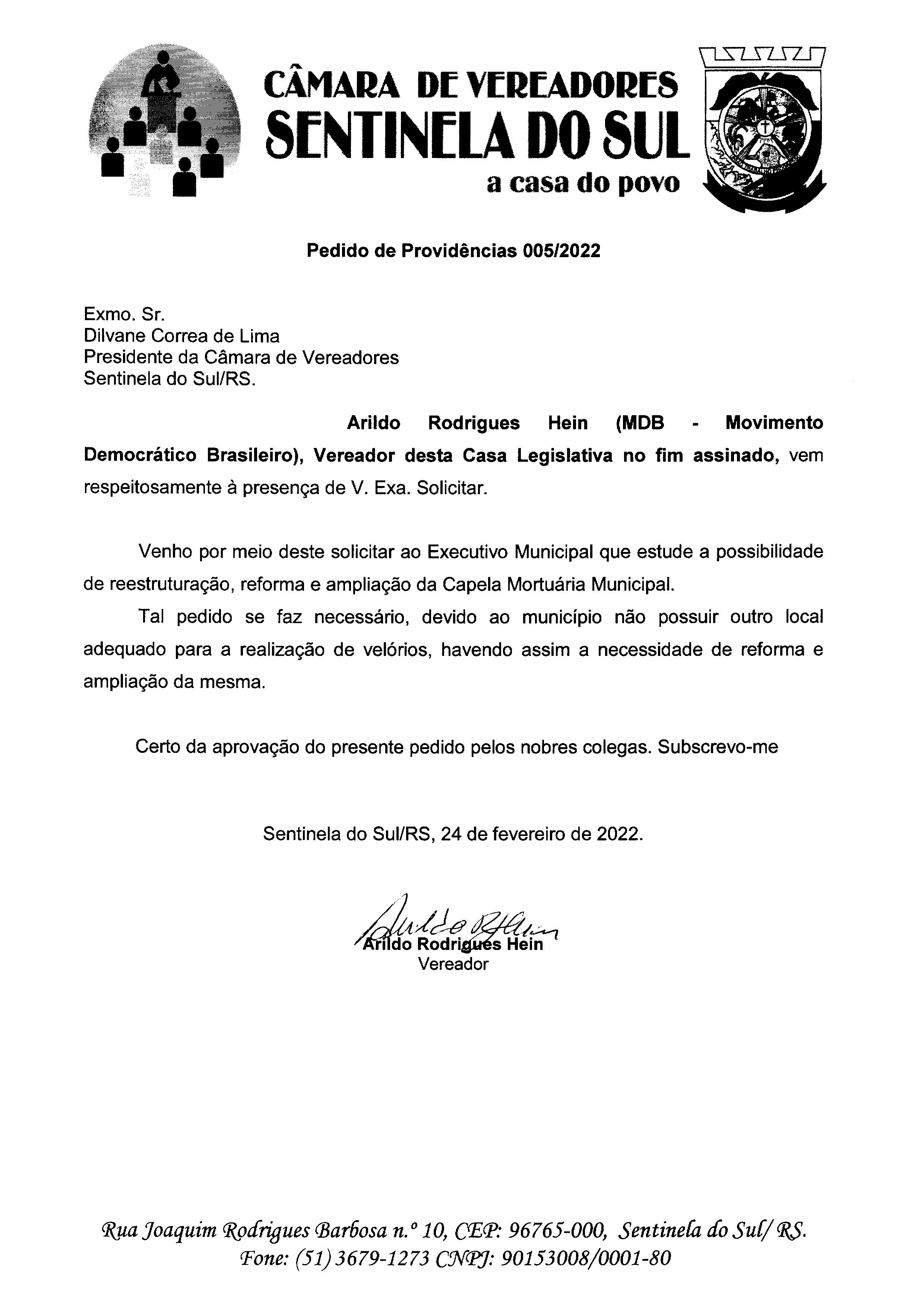 PEDIDO DE PROVIDÊNCIAS Nº 005/2022