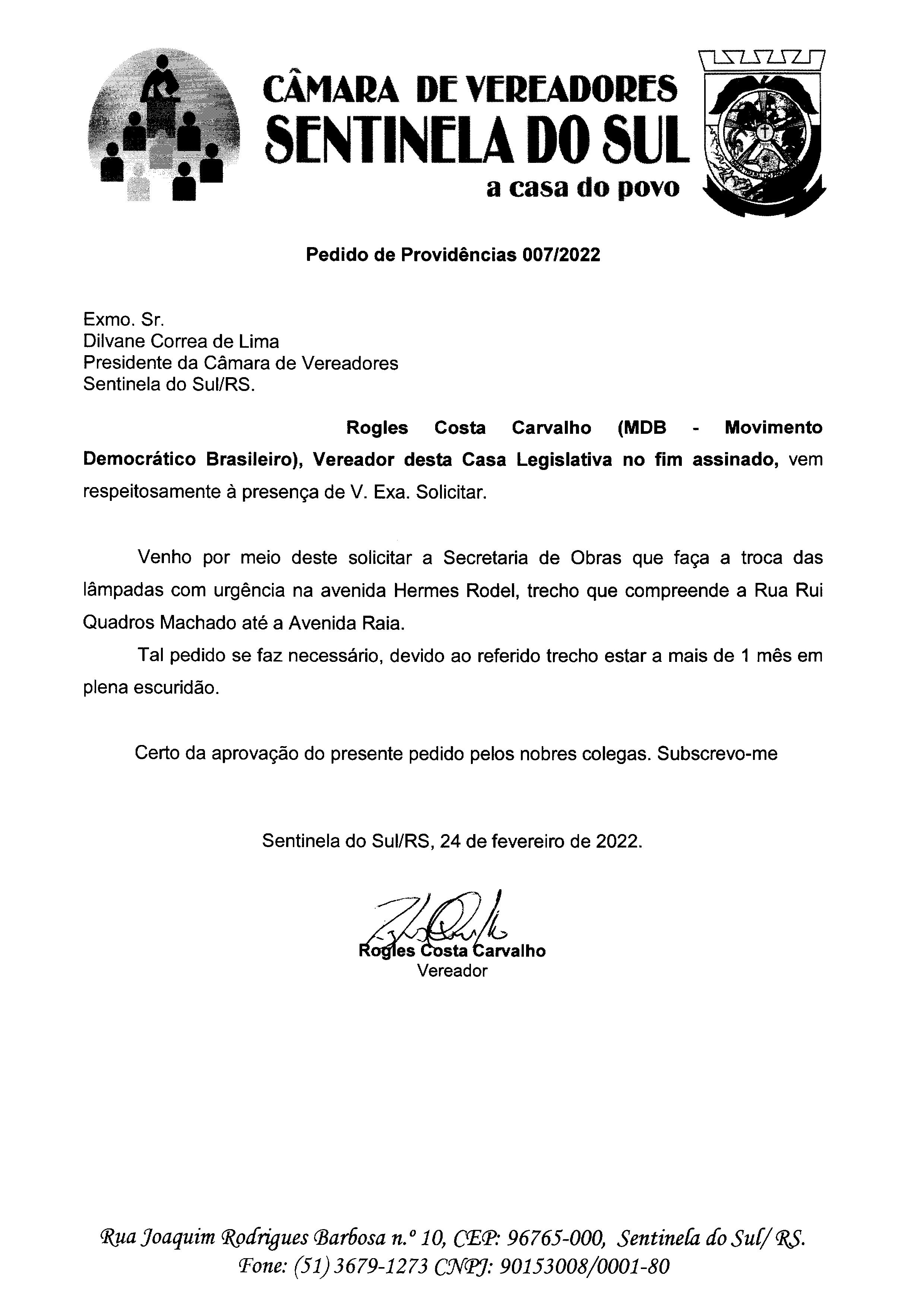 Pedido de Providências de autoria do vereador Rogles Costa Carvalho
