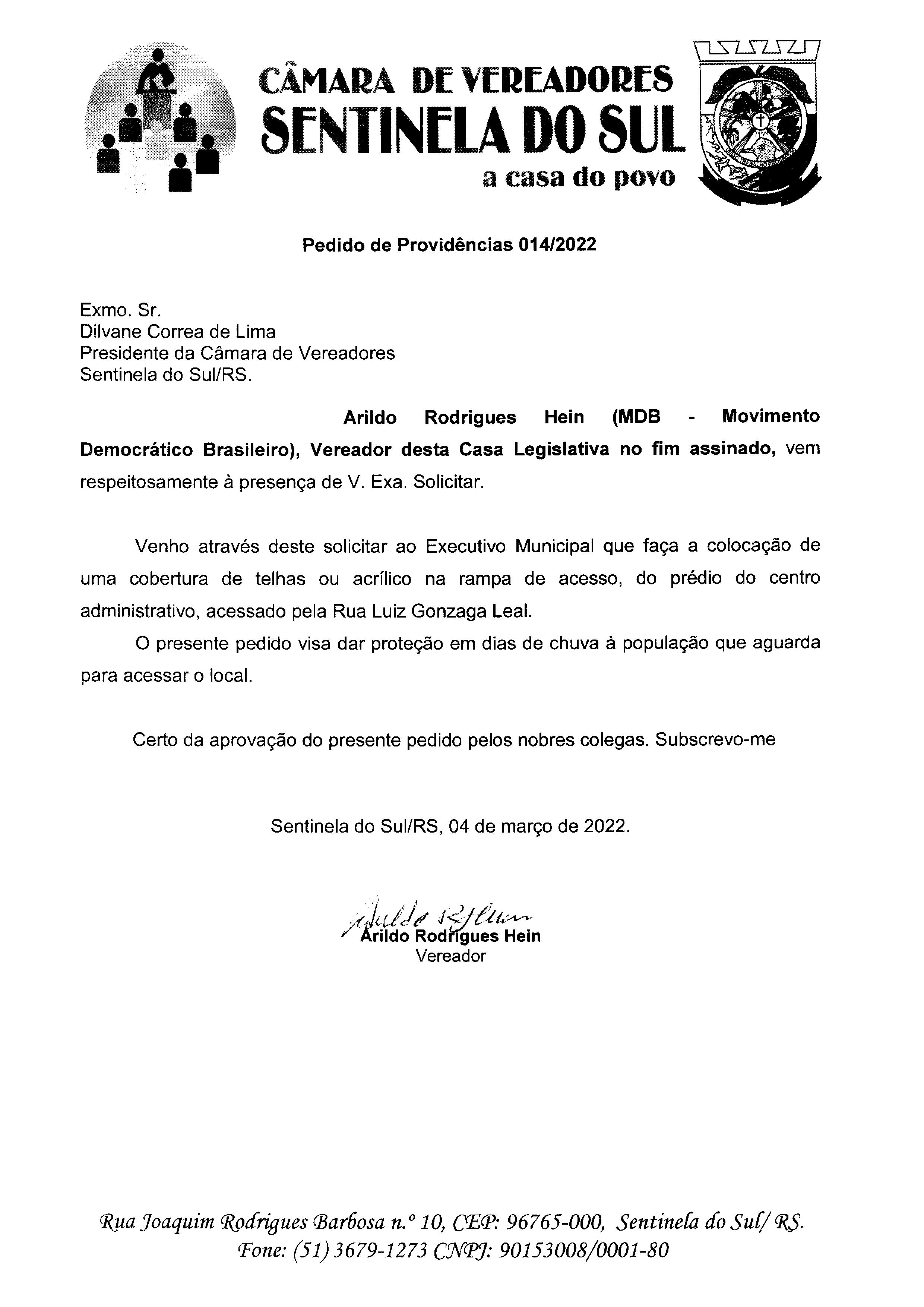 Pedido de Providências de autoria do Vereador Arildo Rodrigues Hein
