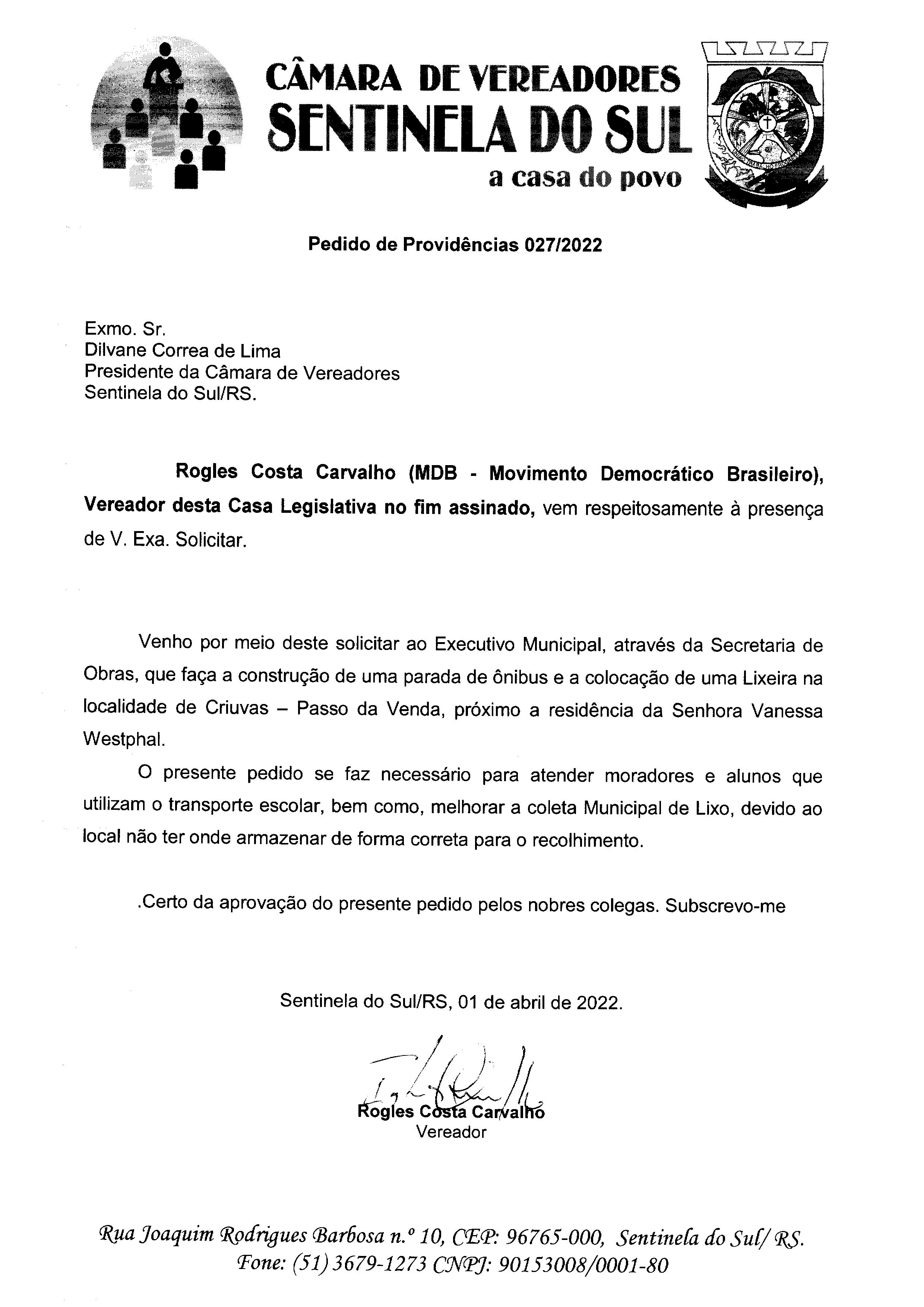 Pedido de Providências de autoria do vereador Rogles Costa Carvalho