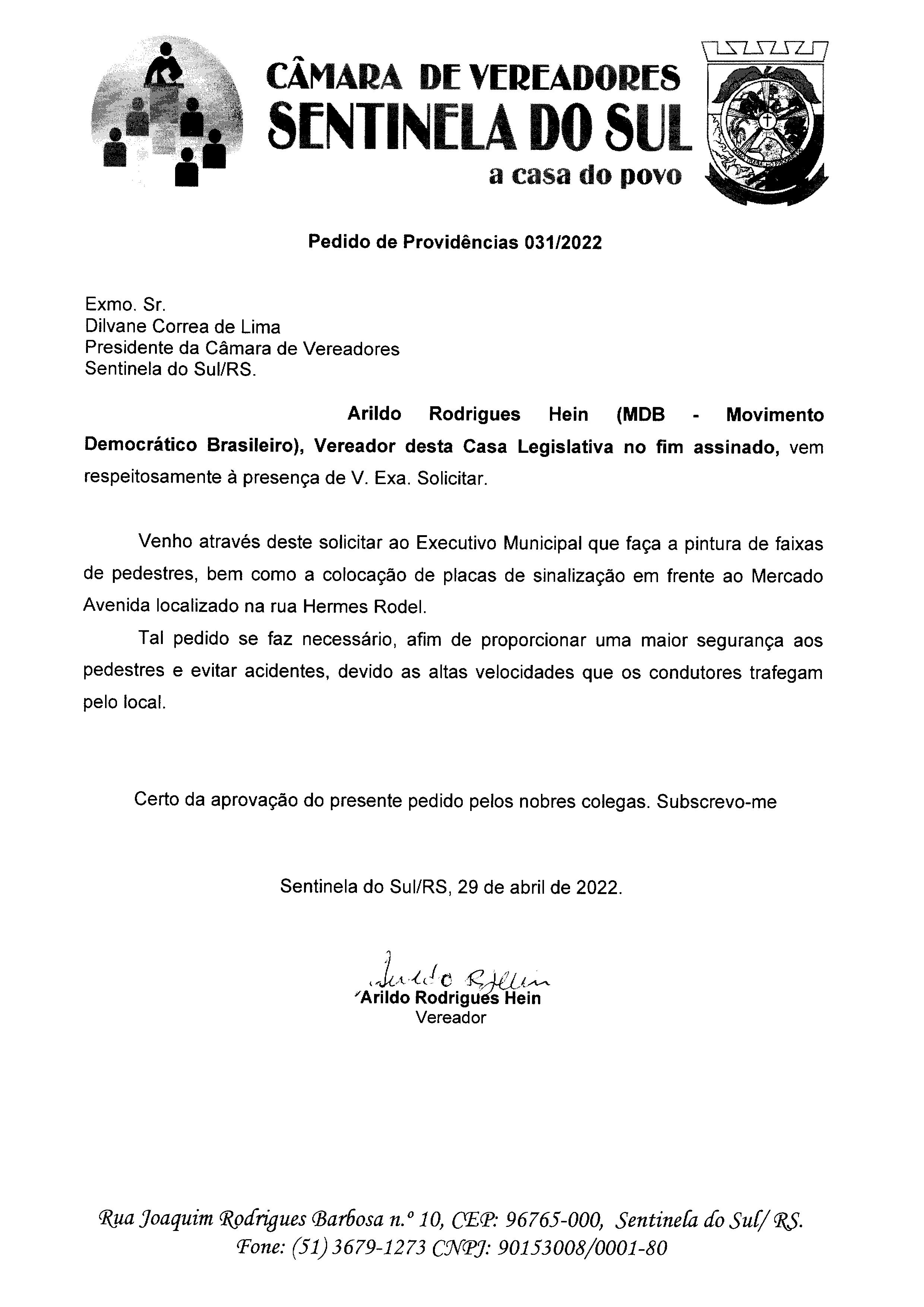 Pedido de Providências de autoria do vereador Arildo Rodrigues Hein