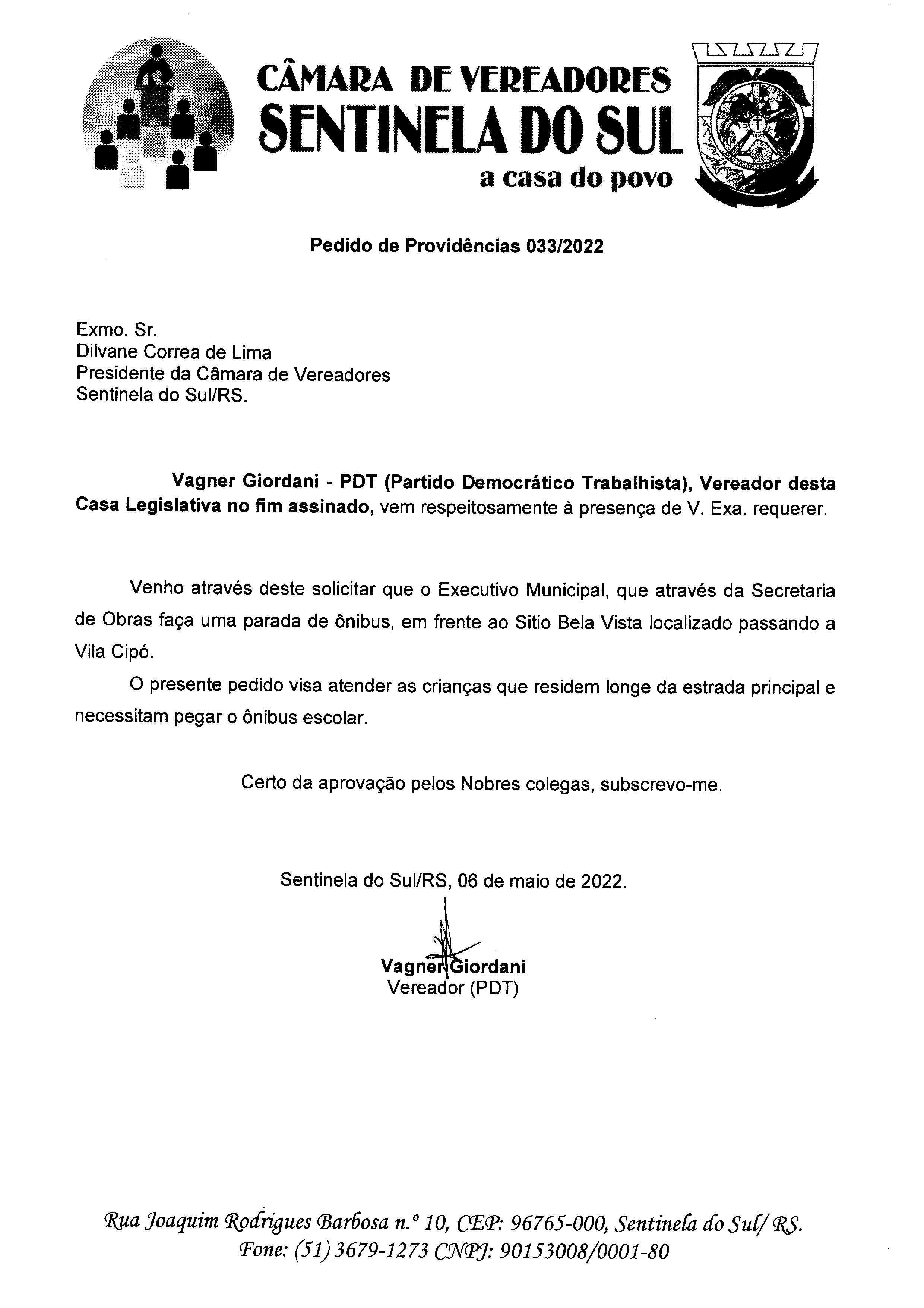 PEDIDO DE PROVIDÊNCIAS Nº 033/2022