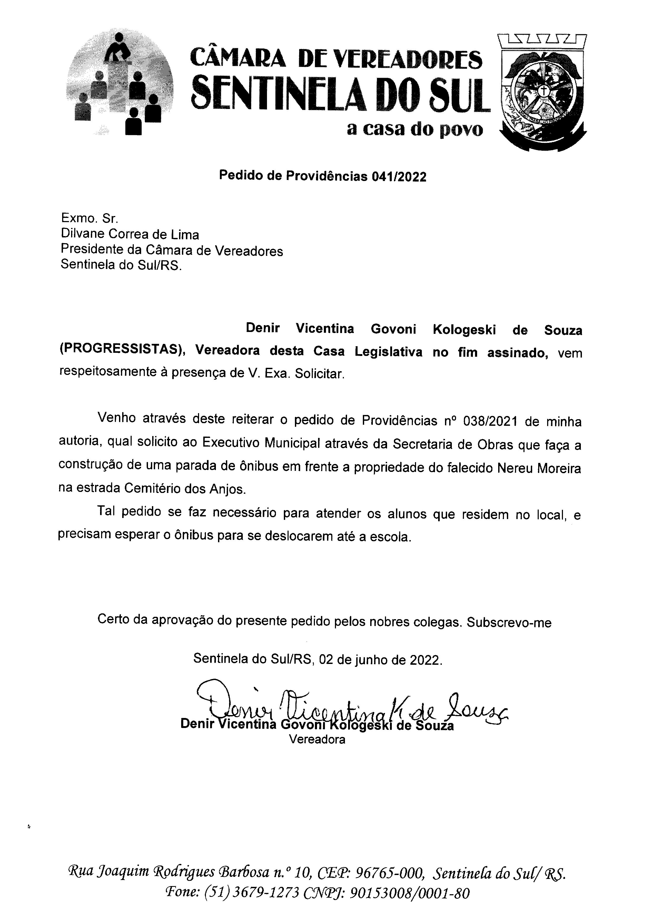 Pedido de Providências de autoria da Vereadora Denir Vicentina Govoni Kologeski de Souza