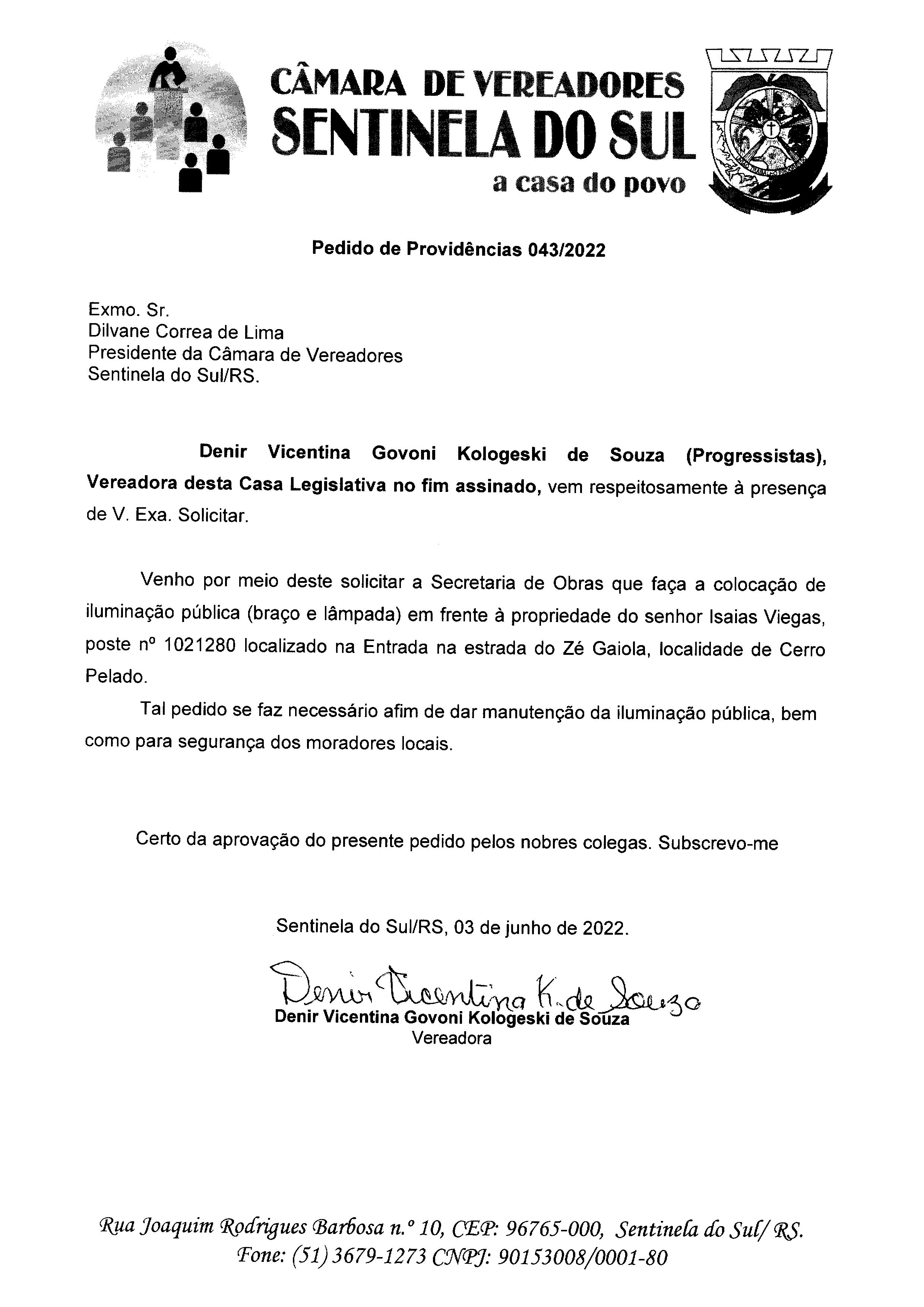 Pedido de Providências de autoria da Vereadora Denir Vicentina Govoni Kologeski de Souza