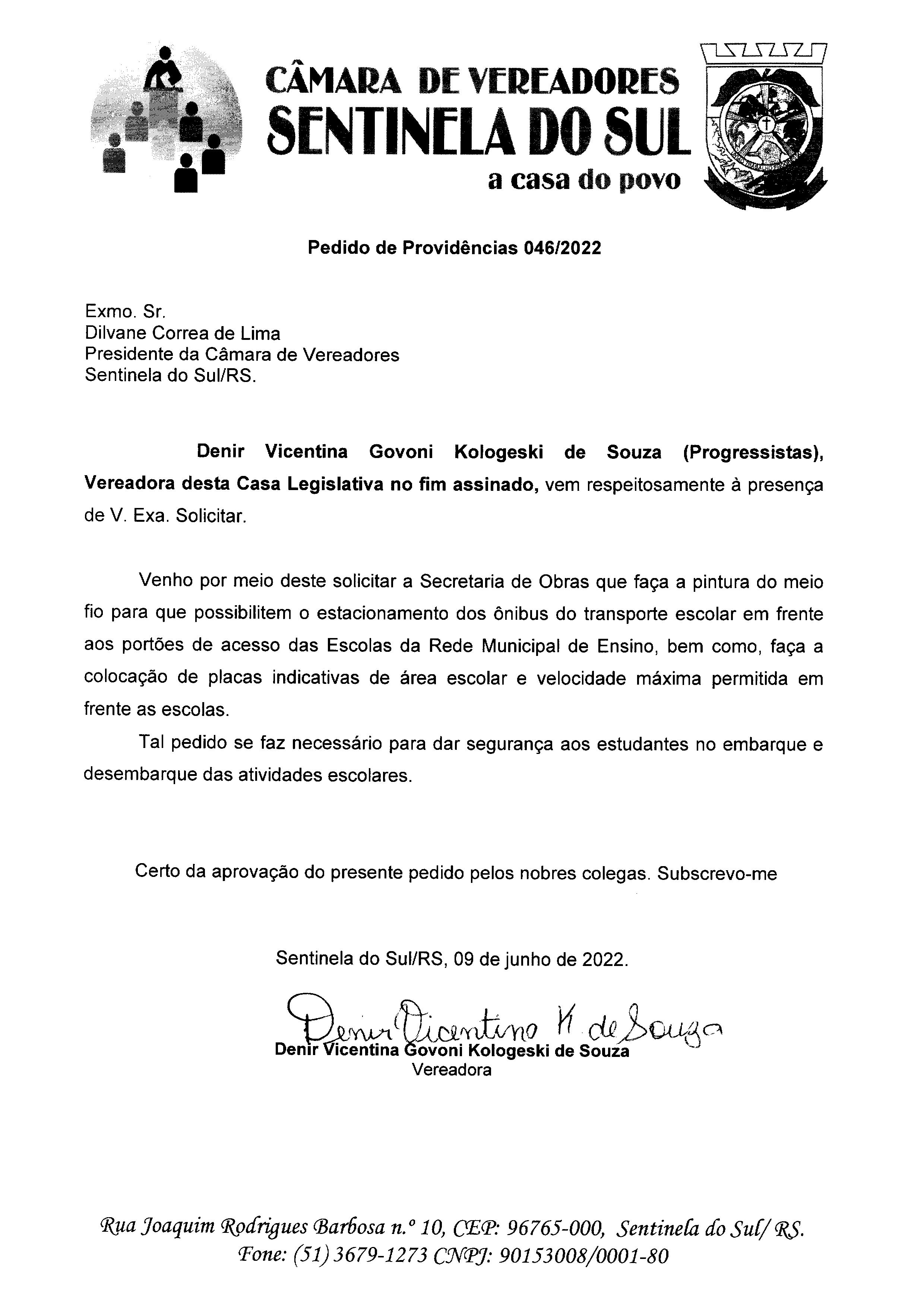 Pedido de Providências de autoria da Vereadora Denir Vicentina Govoni Kologeski de Souza