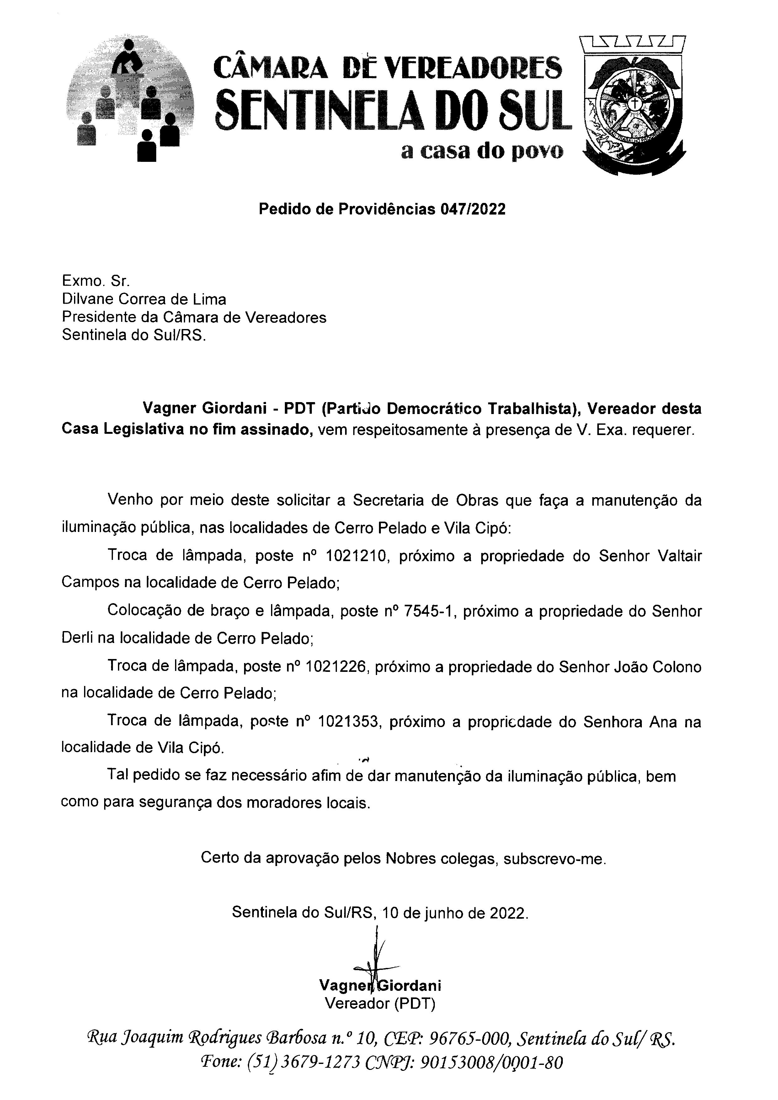 PEDIDO DE PROVIDÊNCIAS Nº 047/2022