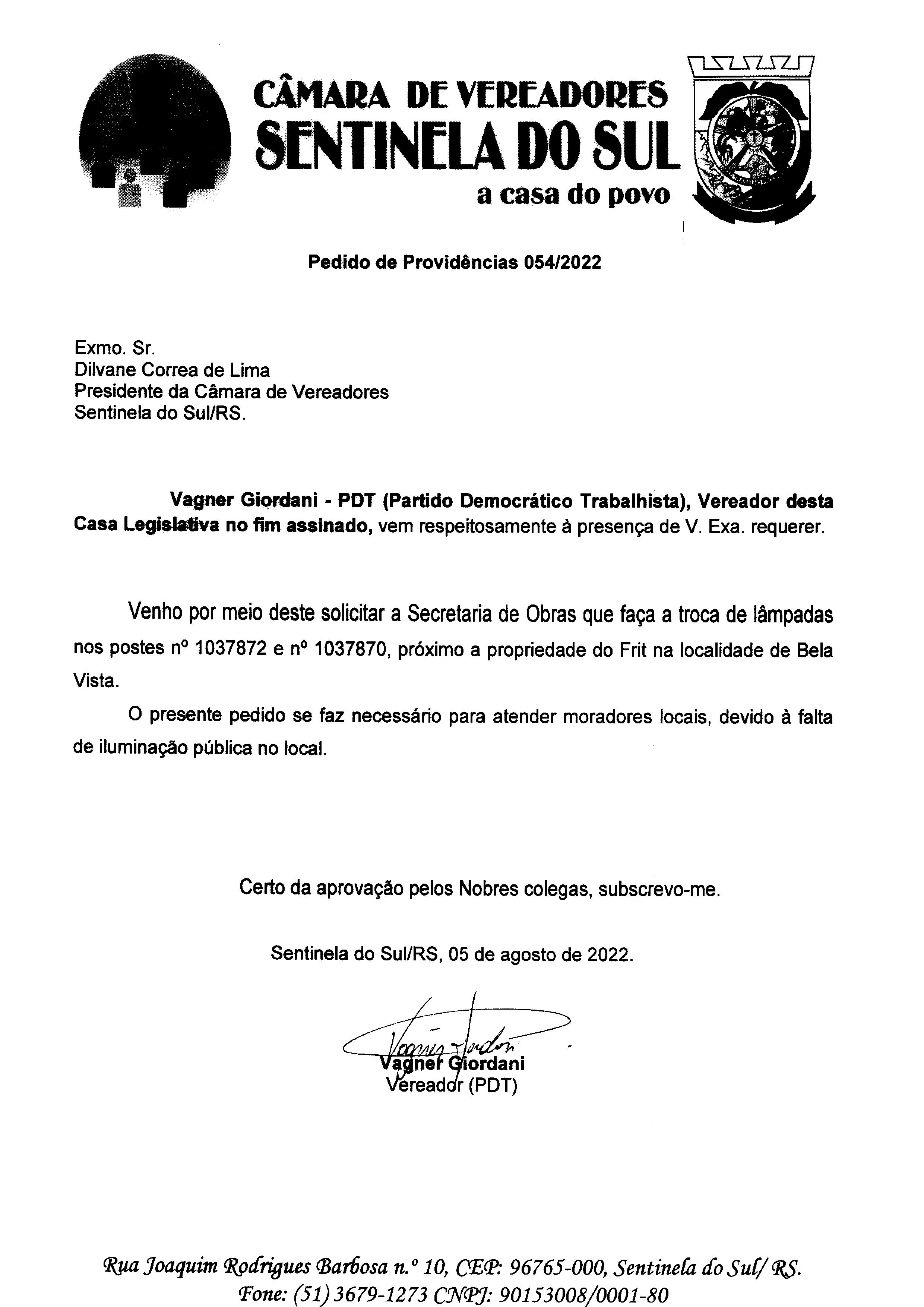PEDIDO DE PROVIDÊNCIAS Nº 054/2022